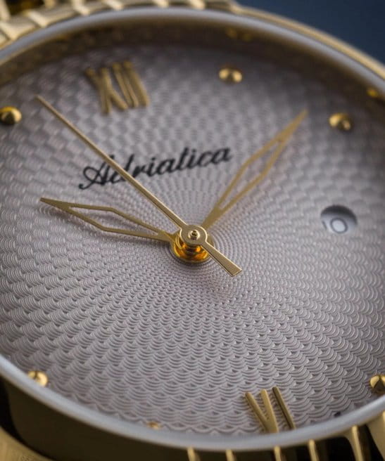 Женские часы Adriatica Essence A3792.1187Q имеют кварцевый механизм с высокой точностью. Минеральное стеклоМинеральное стеклоМинеральное стекло представляет собой искусственно выращенный минерал кварца. Такое стекло отличается особой устойчивостью к повреждениям и царапинам. Уступает по некоторым качествам сапфировому стеклу. обеспечивает надежную защиту серого циферблата, на котором расположилось окошко даты в районе 3 часа, а также метки в виде точек и римские цифры VI и XII. Корпус часов изготовлен из нержавеющей стали с золотистым PVDPVDУльтратонкое покрытие наносится в технике вакуумного напыления, сочетает в себе нитрид титана особой прочности со слоем золота или оксида хрома. Несёт в себе декоративную или защитную функцию. покрытием, что придает часам утонченный и стильный вид.  Браслет из нержавеющей стали с золотистым PVDPVDУльтратонкое покрытие наносится в технике вакуумного напыления, сочетает в себе нитрид титана особой прочности со слоем золота или оксида хрома. Несёт в себе декоративную или защитную функцию. покрытием и ювелирной застежкой, гармонично дополняет общий дизайн и обеспечивает комфортное ношение на запястье. Надежный кварцевый механизм с калибром RONDA 785 гарантирует точность времени, а водозащита WR 30 (3 ATM) делает эти часы практичным выбором для повседневного использования.