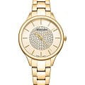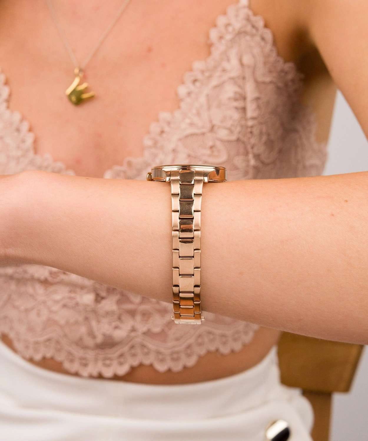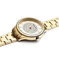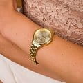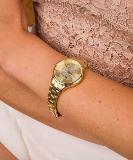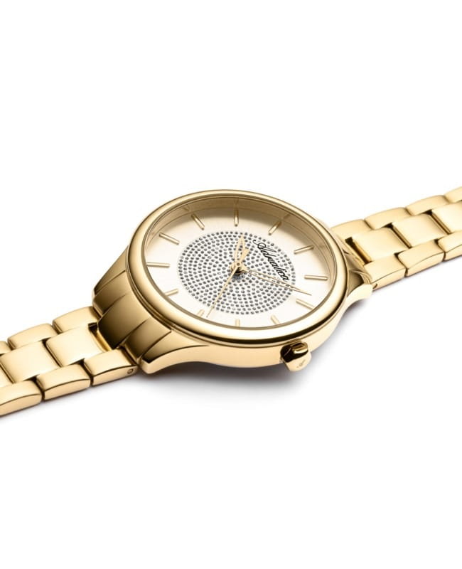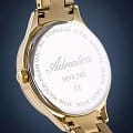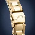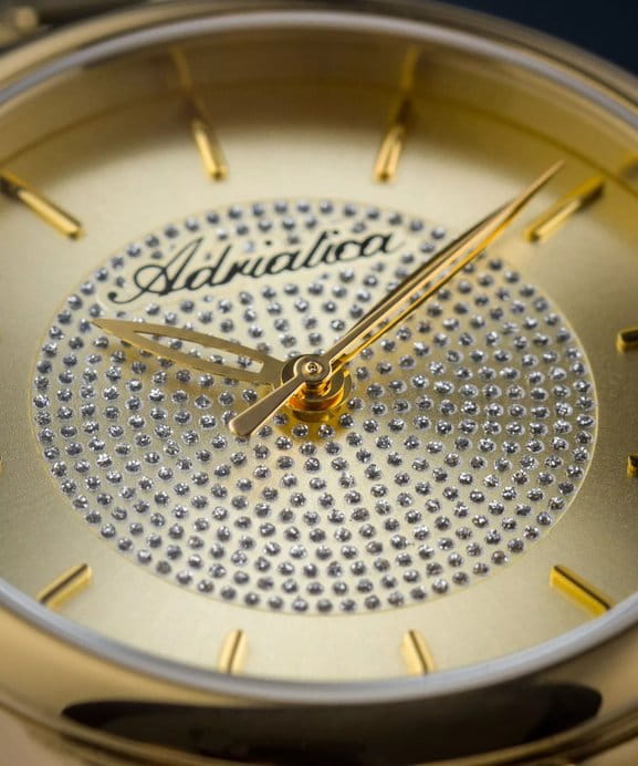 Женские часы Adriatica Essence A3818.1111Q имеют кварцевый механизм с высокой точностью. Минеральное стеклоМинеральное стеклоМинеральное стекло представляет собой искусственно выращенный минерал кварца. Такое стекло отличается особой устойчивостью к повреждениям и царапинам. Уступает по некоторым качествам сапфировому стеклу. обеспечивает надежную защиту золотистого циферблата, который украшен кристаллами. Корпус часов изготовлен из нержавеющей стали с золотистым PVDPVDУльтратонкое покрытие наносится в технике вакуумного напыления, сочетает в себе нитрид титана особой прочности со слоем золота или оксида хрома. Несёт в себе декоративную или защитную функцию. покрытием, что придает часам утонченный и стильный вид.  Браслет из нержавеющей стали с золотистым PVDPVDУльтратонкое покрытие наносится в технике вакуумного напыления, сочетает в себе нитрид титана особой прочности со слоем золота или оксида хрома. Несёт в себе декоративную или защитную функцию. покрытием и раскладной застёжкойРаскладная застёжкаТакой тип застёжки используется только на браслетах из металла. Она никогда не раскрывается полностью, происходит разделение на 2 и более частей. Раскладывающая застёжка снизит вероятность потери часов к минимуму., гармонично дополняет общий дизайн и обеспечивает комфортное ношение на запястье. Надежный кварцевый механизм с калибром RONDA 763 гарантирует точность времени, а водозащита WR 30 (3 ATM) делает эти часы практичным выбором для повседневного использования.
