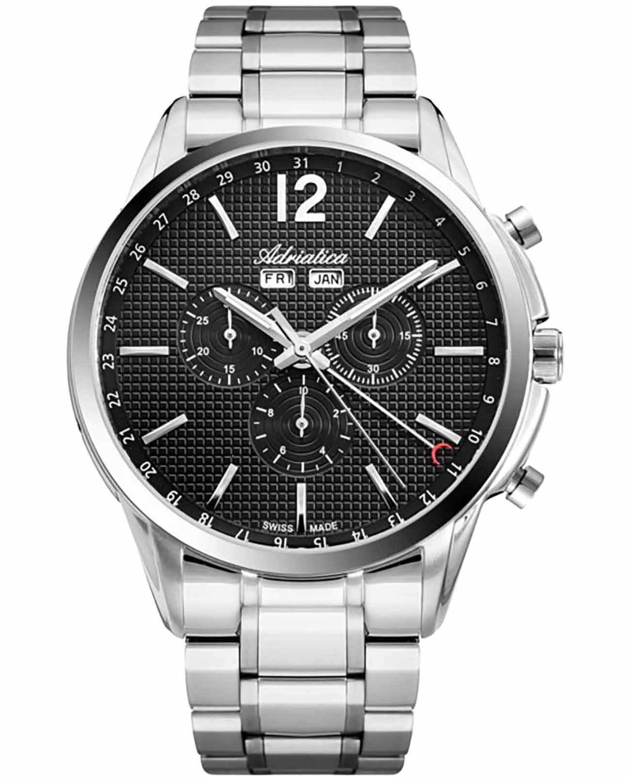 Мужские швейцарские часы-хронографХронографФункция позволяет измерять отрезки времени с особой точностью: часы, минуты, секунды. Верным признаком хронографа является наличие на циферблате 3 дополнительных окошек-счётчиков. с секундомеромСекундомерСекундоме́р — прибор, способный измерять интервалы времени с точностью до долей секунды. Adriatica Passion A8283.5154CH имеют кварцевый механизм с высокой точностью. Сапфировое стеклоСапфировое стеклоПрочный и надёжный материал из кристалла сапфира синтетического происхождения, характеризующийся особой твёрдостью и устойчивостью к царапинам и повреждениям. устойчивое к появлению царапин, обладающее высокой прозрачностью защищает текстурированный черный циферблат с метками в виде штрихов и арабской цифры 12. Месяц и день недели отображаются в отдельных окошках, а дата отображается центральной стрелкой, также часы имеют 3 дополнительных циферблата. Корпус часов изготовлен из нержавеющей стали. На часовую, минутную стрелки нанесено люминесцентное покрытиеЛюминесцентное покрытиеПозволяет считывать показания времени в темноте. Производители наносят на стрелки, часовые индексы, безель или поверхность циферблата светонакопительный состав, дающий холодное свечение., которое светится в темноте, создавая необычное изображение. Стальной браслет с раскладной застёжкойРаскладная застёжкаТакой тип застёжки используется только на браслетах из металла. Она никогда не раскрывается полностью, происходит разделение на 2 и более частей. Раскладывающая застёжка снизит вероятность потери часов к минимуму. обеспечивает комфортное ношение и надежную фиксацию на запястье. Надежный кварцевый механизм с калибром RONDA 5040.F гарантирует точность времени, а водозащита 50 метров, позволит плавать, что позволит защитить корпус от случайных брызг или капель дождя.