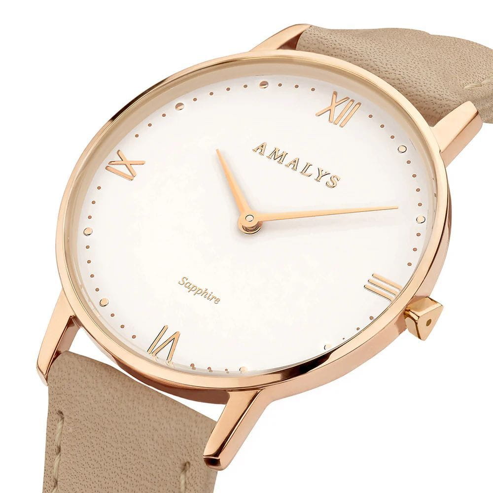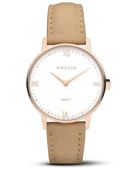Amalys AMW-186 — женская модель с утончённым классическим дизайном, в которой сочетаются элегантность и практичность. Круглый корпус диаметром 33 мм выполнен из нержавеющей стали с PVD-покрытиемPVDУльтратонкое покрытие наносится в технике вакуумного напыления, сочетает в себе нитрид титана особой прочности со слоем золота или оксида хрома. Несёт в себе декоративную или защитную функцию., гармонирующим с ремешком шириной 16 мм в том же исполнении. Защитную функцию выполняет сапфировое стеклоСапфировое стеклоПрочный и надёжный материал из кристалла сапфира синтетического происхождения, характеризующийся особой твёрдостью и устойчивостью к царапинам и повреждениям., стойкое к царапинам и сохраняющее прозрачность. Механизм — кварцевый, обеспечивающий точность и стабильность хода. Кожаный ремешок на стандартной застежке, который сочетает надёжность фиксации и удобство повседневного использования. Водозащита 3 ATM защищает часы от случайных брызг и дождя. Циферблат с римскими индексами и изящными стрелками подчёркивает классическую эстетику модели, делая её уместной как в повседневных образах, так и в торжественной обстановке.