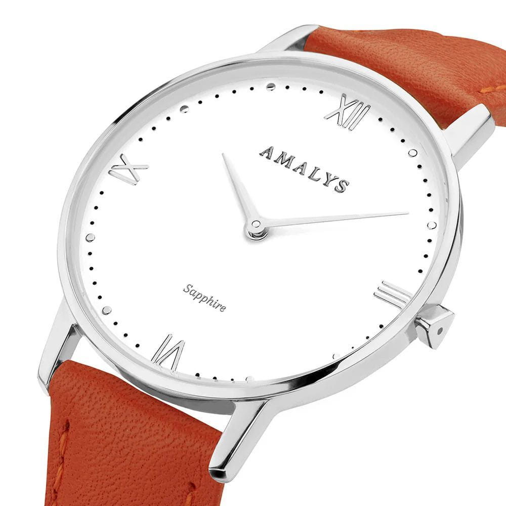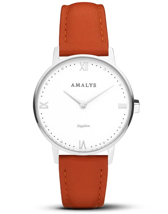 Amalys AMW-187 — женская модель с утончённым классическим дизайном, в которой сочетаются элегантность и практичность. Круглый корпус диаметром 33 мм выполнен из нержавеющей стали, гармонирующим с ремешком шириной 16 мм в том же исполнении. Защитную функцию выполняет сапфировое стеклоСапфировое стеклоПрочный и надёжный материал из кристалла сапфира синтетического происхождения, характеризующийся особой твёрдостью и устойчивостью к царапинам и повреждениям., стойкое к царапинам и сохраняющее прозрачность. Механизм — кварцевый, обеспечивающий точность и стабильность хода. Кожаный ремешок на стандартной застежке, который сочетает надёжность фиксации и удобство повседневного использования. Водозащита 3 ATM защищает часы от случайных брызг и дождя. Циферблат с римскими индексами и изящными стрелками подчёркивает классическую эстетику модели, делая её уместной как в повседневных образах, так и в торжественной обстановке.