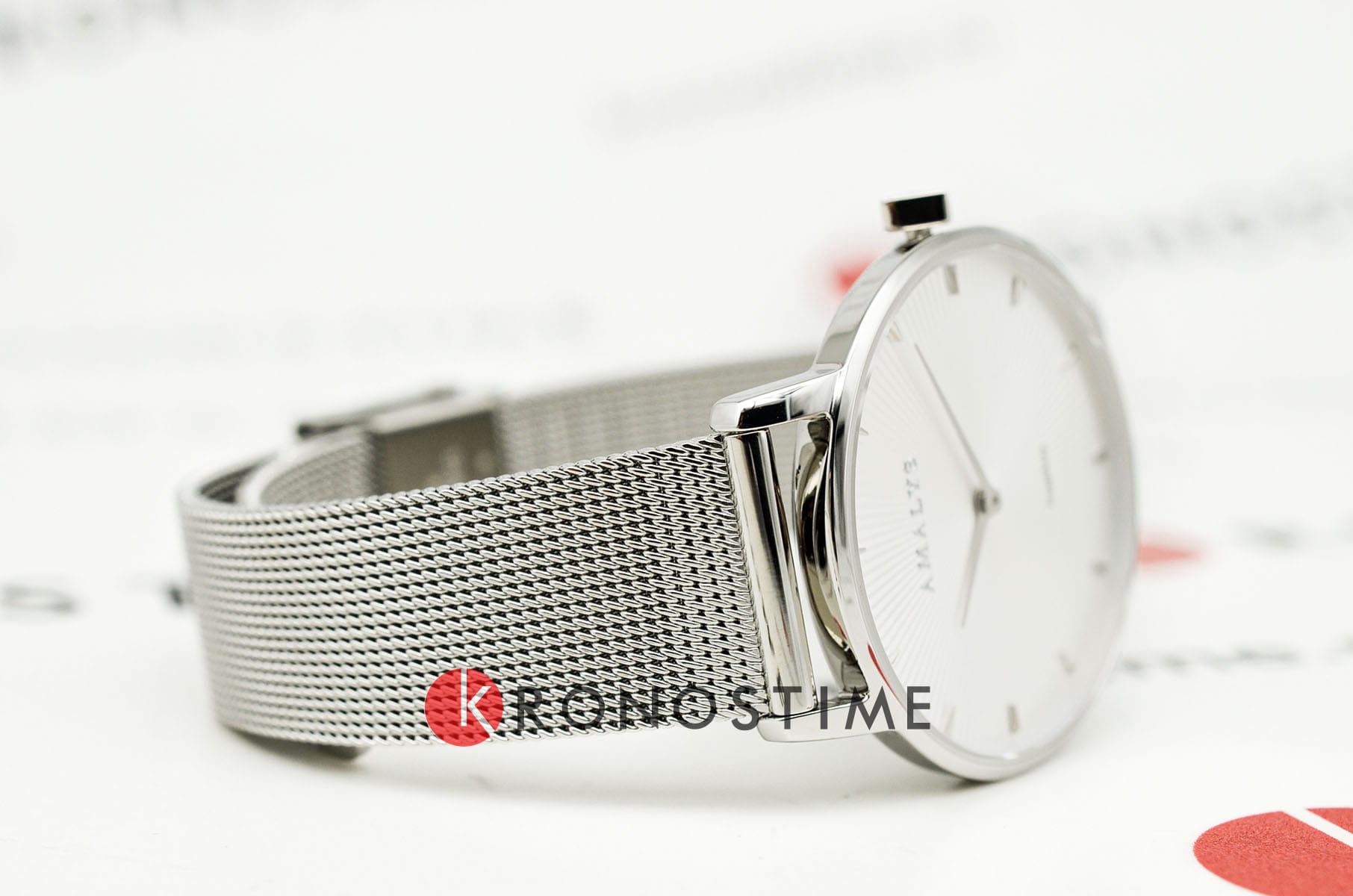 Amalys AMW-194 — женский набор, включающий часы и браслет, выполненный в едином элегантном стиле. Круглый корпус диаметром 33 мм изготовлен из нержавеющей стали, что подчёркивает изысканный характер модели. Защитную функцию выполняет сапфировое стеклоСапфировое стеклоПрочный и надёжный материал из кристалла сапфира синтетического происхождения, характеризующийся особой твёрдостью и устойчивостью к царапинам и повреждениям., стойкое к царапинам и сохраняющее прозрачность. Механизм — кварцевый, обеспечивающий точность хода и удобство в использовании. Водозащита 3 ATM защищает от случайных брызг и дождя. Циферблат оформлен в минималистичном стиле с тонкими метками и изящными стрелками, подчёркивающими женственный образ. Стальной браслет миланского плетения на раскладном замкеРаскладной замокДанный вариант застежки используется только на часах с металлическим браслетом. Отличительная особенность такого крепления в том, что длина браслета становится универсальной и вы можете самостоятельно отрегулировать нужный вам размер – застежка просто двигается по браслету часов. мягко облегает запястье и гармонично сочетается с корпусом. Дополняющий набор браслет усиливает впечатление цельности и придаёт образу завершённость.
