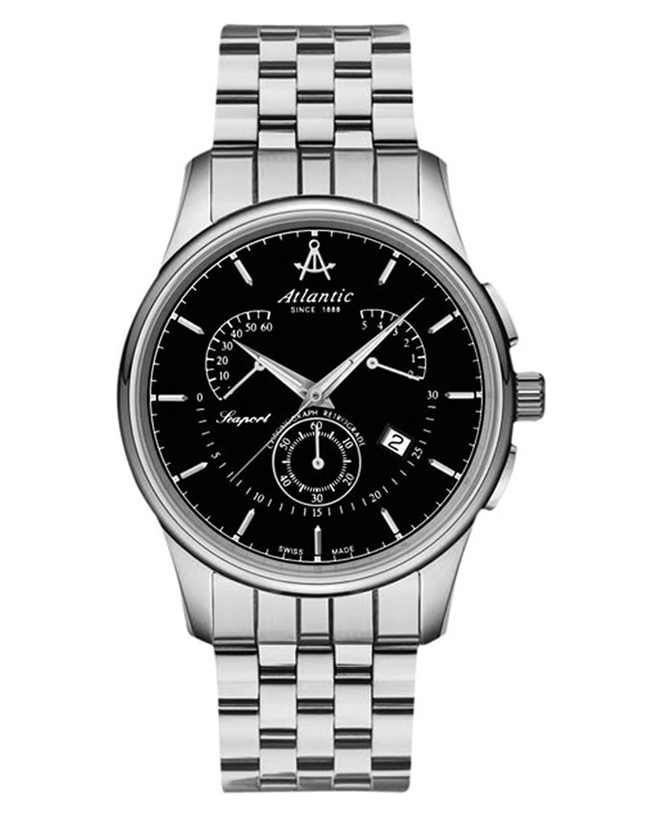 Мужские швейцарские часы-хронографХронографФункция позволяет измерять отрезки времени с особой точностью: часы, минуты, секунды. Верным признаком хронографа является наличие на циферблате 3 дополнительных окошек-счётчиков. Atlantic Seaport 56455.41.61, кварцевый механизм с высокой точностью.  Cапфировое стеклоСапфировое стеклоПрочный и надёжный материал из кристалла сапфира синтетического происхождения, характеризующийся особой твёрдостью и устойчивостью к царапинам и повреждениям. устойчивое к появлению царапин и обладающее высокой прозрачностью. Корпус и браслет часов изготовлены из нержавеющей стали. На циферблате расположены три дополнительных индикатора, окошко даты находится в положении 4 часов. Стрелки с люминесцентным покрытиемЛюминесцентное покрытиеПозволяет считывать показания времени в темноте. Производители наносят на стрелки, часовые индексы, безель или поверхность циферблата светонакопительный состав, дающий холодное свечение.. Класс водозащиты: 50 метров, позволит защитить корпус от случайных брызг или капель дождя. Стальной браслет на раскладной застёжкеРаскладная застёжкаТакой тип застёжки используется только на браслетах из металла. Она никогда не раскрывается полностью, происходит разделение на 2 и более частей. Раскладывающая застёжка снизит вероятность потери часов к минимуму..