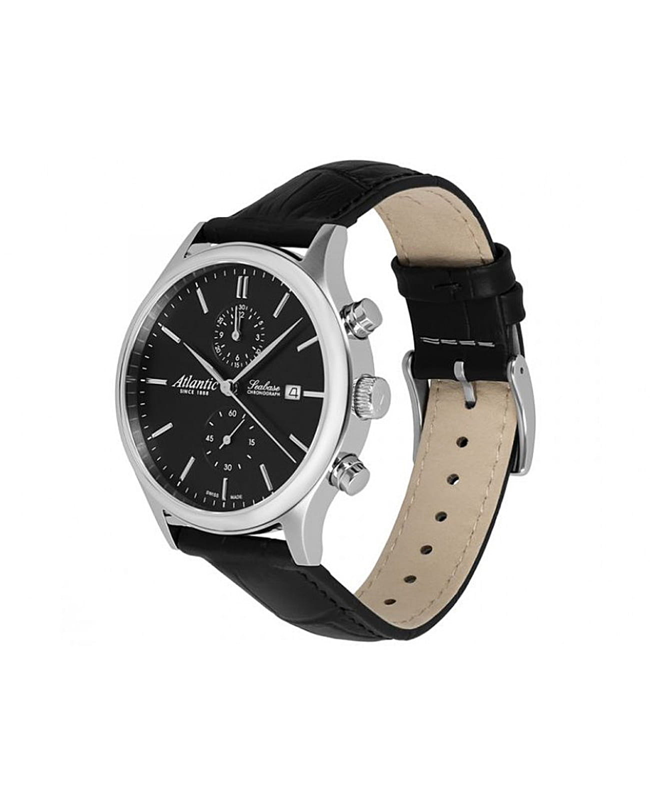 Мужские швейцарские часы-хронографХронографФункция позволяет измерять отрезки времени с особой точностью: часы, минуты, секунды. Верным признаком хронографа является наличие на циферблате 3 дополнительных окошек-счётчиков. с секундомеромСекундомерСекундоме́р — прибор, способный измерять интервалы времени с точностью до долей секунды. Atlantic Seabase 64452.41.61, кварцевый механизм с высокой точностью. Cапфировое стеклоСапфировое стеклоПрочный и надёжный материал из кристалла сапфира синтетического происхождения, характеризующийся особой твёрдостью и устойчивостью к царапинам и повреждениям. устойчивое к появлению царапин и обладающее высокой прозрачностью. Корпус часов изготовлен из нержавеющей стали. На циферблате расположены два дополнительных индикатора, окошко даты в положении 3 часов. Класс водозащиты: 50 метров, позволит защитить корпус от случайных брызг или капель дождя. Кожаный ремешок на стандартной застежке.