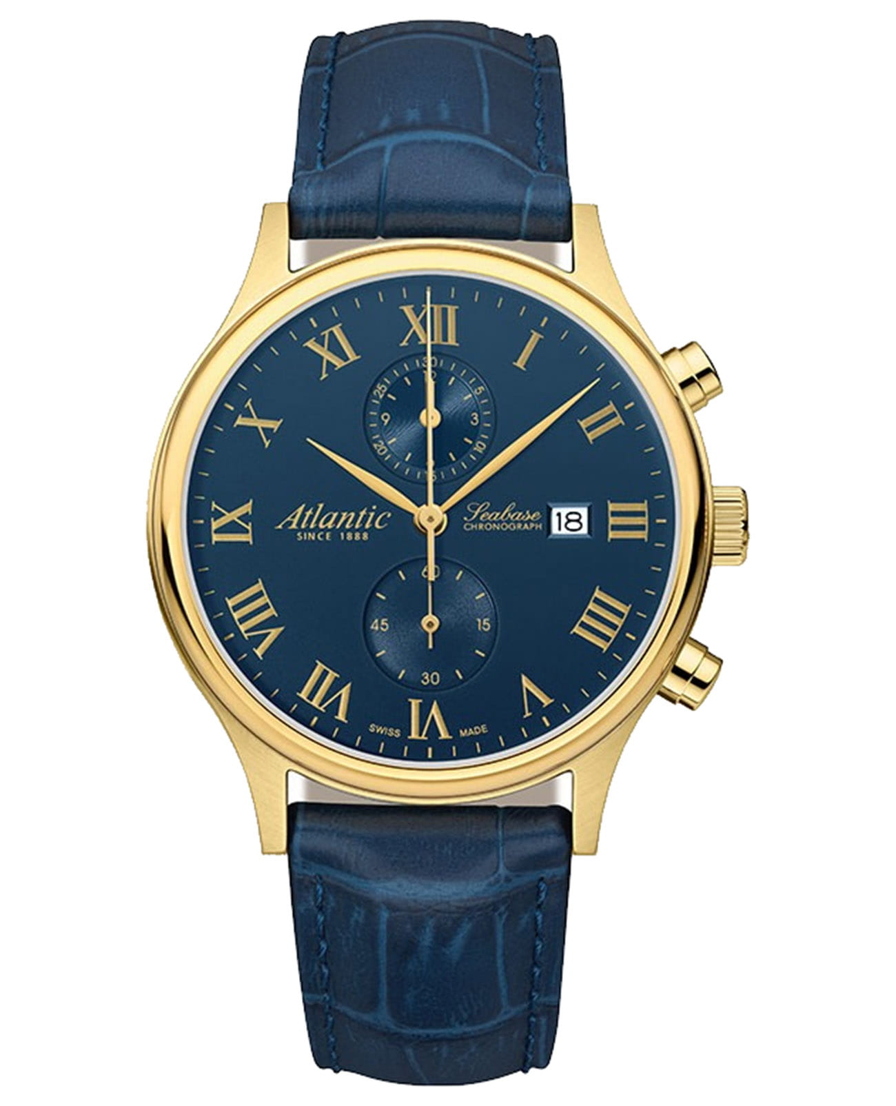 Мужские швейцарские часы-хронографХронографФункция позволяет измерять отрезки времени с особой точностью: часы, минуты, секунды. Верным признаком хронографа является наличие на циферблате 3 дополнительных окошек-счётчиков. с секундомеромСекундомерСекундоме́р — прибор, способный измерять интервалы времени с точностью до долей секунды. Atlantic Seabase 64452.45.58, кварцевый механизм с высокой точностью. Cапфировое стеклоСапфировое стеклоПрочный и надёжный материал из кристалла сапфира синтетического происхождения, характеризующийся особой твёрдостью и устойчивостью к царапинам и повреждениям. устойчивое к появлению царапин и обладающее высокой прозрачностью. Корпус часов изготовлен из нержавеющей стали с PVDPVDУльтратонкое покрытие наносится в технике вакуумного напыления, сочетает в себе нитрид титана особой прочности со слоем золота или оксида хрома. Несёт в себе декоративную или защитную функцию. покрытием. На циферблате расположены римские цифры, два дополнительных индикатора, окошко даты в положении 3 часов. Класс водозащиты: 50 метров, позволит защитить корпус от случайных брызг или капель дождя. Кожаный ремешок на стандартной застежке.