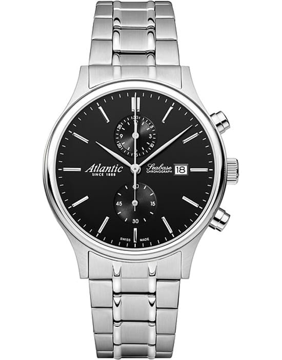 Мужские кварцевые швейцарские часы Atlantic Seabase Quartz Chronograph Edition c хронографомХронографФункция позволяет измерять отрезки времени с особой точностью: часы, минуты, секунды. Верным признаком хронографа является наличие на циферблате 3 дополнительных окошек-счётчиков. 64457.41.61, механизм с высокой точностью. Циферблат часов с сапфировым стекломСапфировое стеклоПрочный и надёжный материал из кристалла сапфира синтетического происхождения, характеризующийся особой твёрдостью и устойчивостью к царапинам и повреждениям., устойчивым к появлению царапин и обладающее высокой прозрачностью. Класс водозащиты: 50 метров, позволит защитить корпус от случайных брызг или капель дождя. Корпус часов изготовлен из нержавеющей стали. Стальной браслет на раскладной застёжкеРаскладная застёжкаТакой тип застёжки используется только на браслетах из металла. Она никогда не раскрывается полностью, происходит разделение на 2 и более частей. Раскладывающая застёжка снизит вероятность потери часов к минимуму.. Окошко даты находится в положении 3 часа.