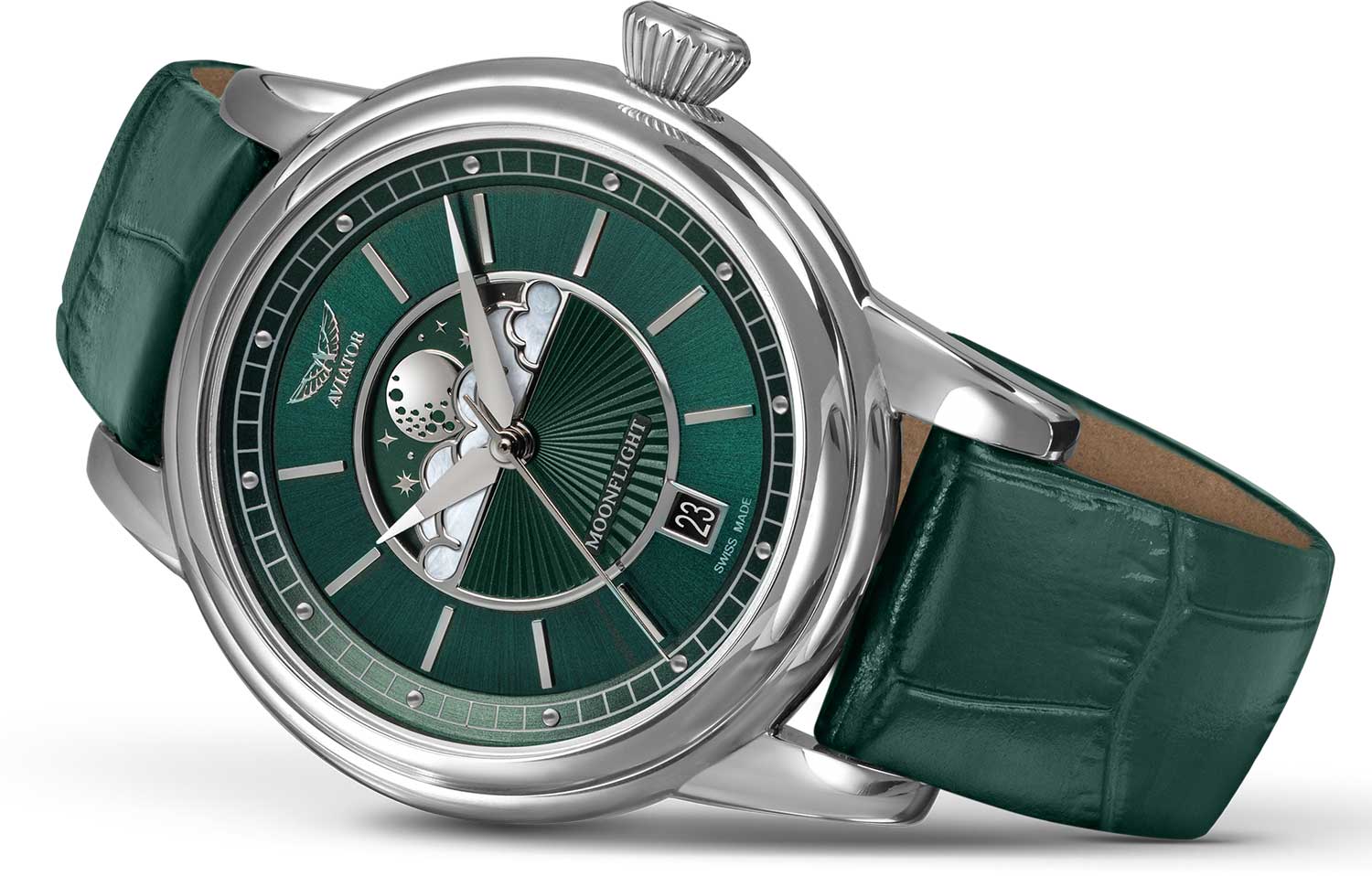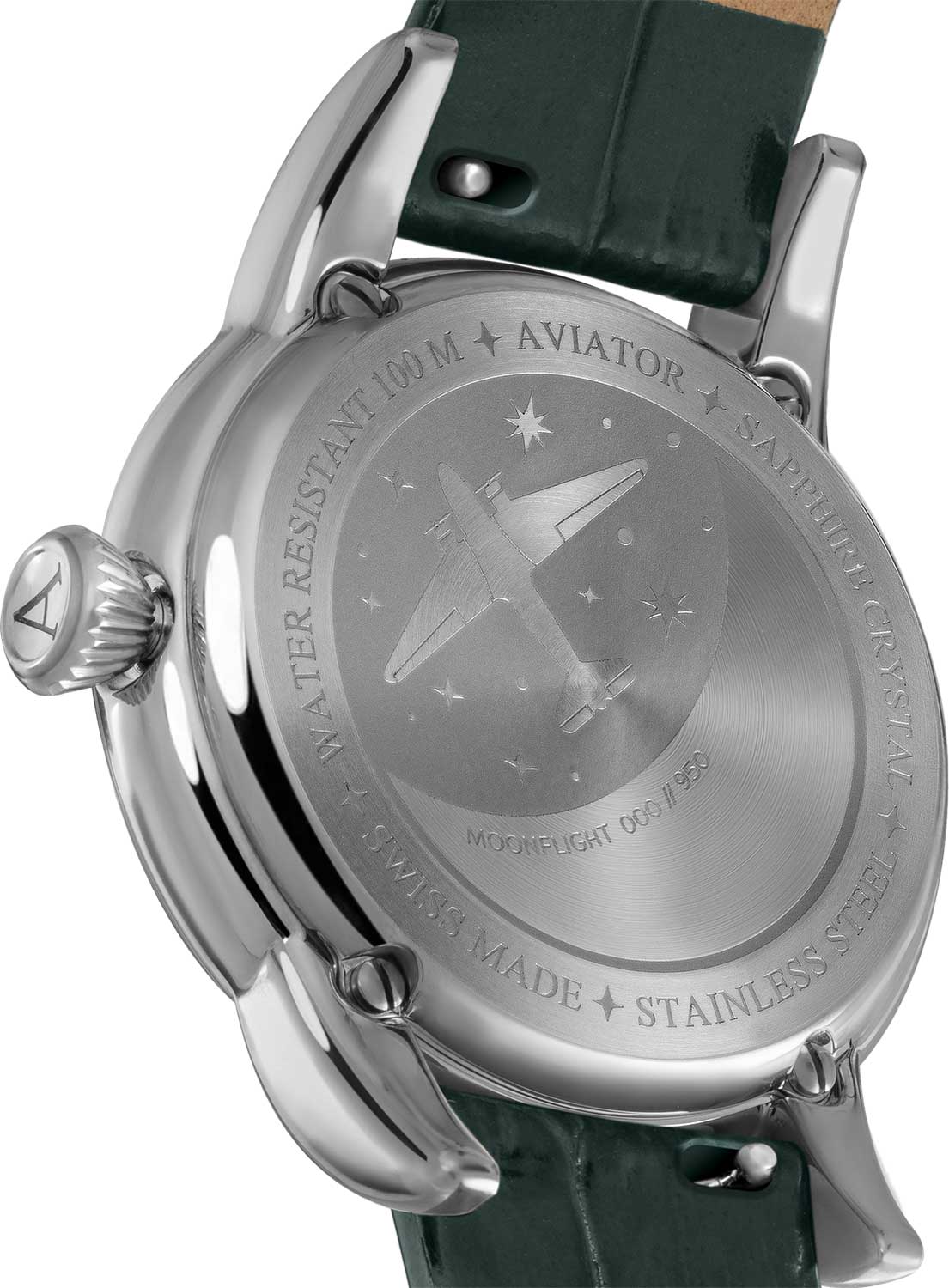 Aviator V.1.33.0.262.4 “Douglas Moonflight” — элегантный дамский швейцарский Moonphase с утончённой авиационной эстетикой. Корпус 36 мм из нержавеющей стали с полированной отделкой обладает компактными пропорциями и удобным литым профилем.