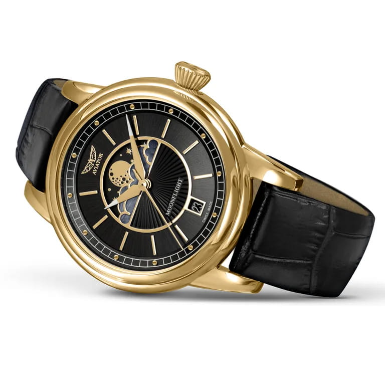 Aviator Douglas MoonFlight V.1.33.1.344.4— элегантные дамские швейцарские часы с утончённой авиационной эстетикой. Корпус 36 мм из нержавеющей стали 316L с PVD-покрытиемPVDУльтратонкое покрытие наносится в технике вакуумного напыления, сочетает в себе нитрид титана особой прочности со слоем золота или оксида хрома. Несёт в себе декоративную или защитную функцию. обладает компактными пропорциями и удобным профилем. Циферблат в стиле Art Deco украшает усложнение фаз Луны в верхней половине, обрамлённой тонким кольцом облаков. Отмечено окно даты в положении «6 часов». Стрелки обработаны люминесцентным покрытиемЛюминесцентное покрытиеПозволяет считывать показания времени в темноте. Производители наносят на стрелки, часовые индексы, безель или поверхность циферблата светонакопительный состав, дающий холодное свечение. Superluminova — для уверенного считывания в темноте. Поверхность защищена сапфировым стекломСапфировое стеклоПрочный и надёжный материал из кристалла сапфира синтетического происхождения, характеризующийся особой твёрдостью и устойчивостью к царапинам и повреждениям. с антибликовым покрытиемАнтибликовое покрытиеСлой оксида металла в 0,13-0,3 микрон, благодаря которому стекло часов не бликует и не отражает свет. Антибликовое покрытие уменьшает отражение света в 10 раз, обеспечивая отличную читаемость показателей циферблата.. Сердце модели — швейцарский кварцевый механизм Ronda 708 с функцией отображения лунных фаз. Водозащита до 100 метров создают надёжную основу для эксплуатации. Кожаный ремень со стандартной застежкой сочетает в себе комфорт, элегантность и практичность. Aviator Douglas MoonFlight — это гармоничное сочетание авиационного наследия, женской элегантности и технической изысканности, воплощённое в элегантном и функциональном аксессуаре. Лимитированная серия.