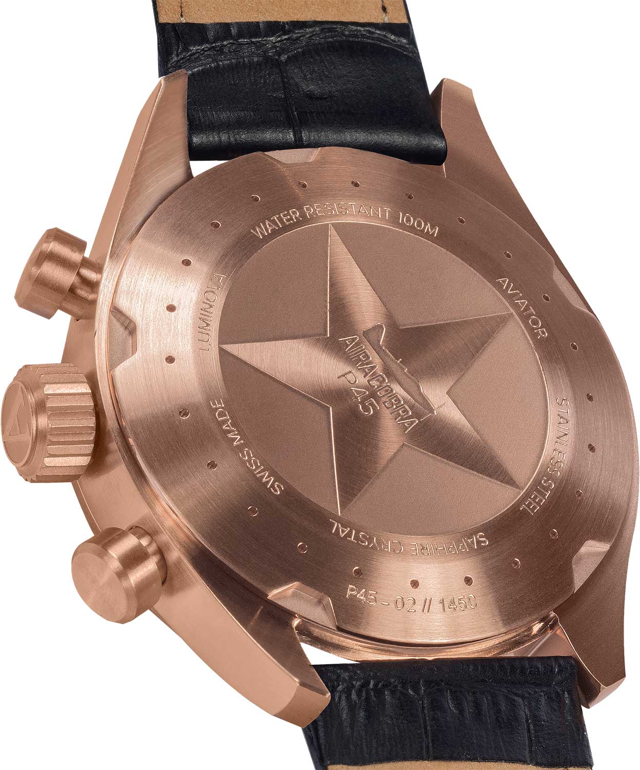 Aviator Airacobra V.2.25.2.173.4 — швейцарский GMT-хронограф в духе пилотских инструментов, объединяющий точность, удобство и лаконичный дизайн. Диаметр корпуса — 45 мм, выполнен из нержавеющей стали с PVD-покрытиеPVDУльтратонкое покрытие наносится в технике вакуумного напыления, сочетает в себе нитрид титана особой прочности со слоем золота или оксида хрома. Несёт в себе декоративную или защитную функцию., что подчёркивает техническую надёжность в образе часов.
