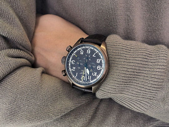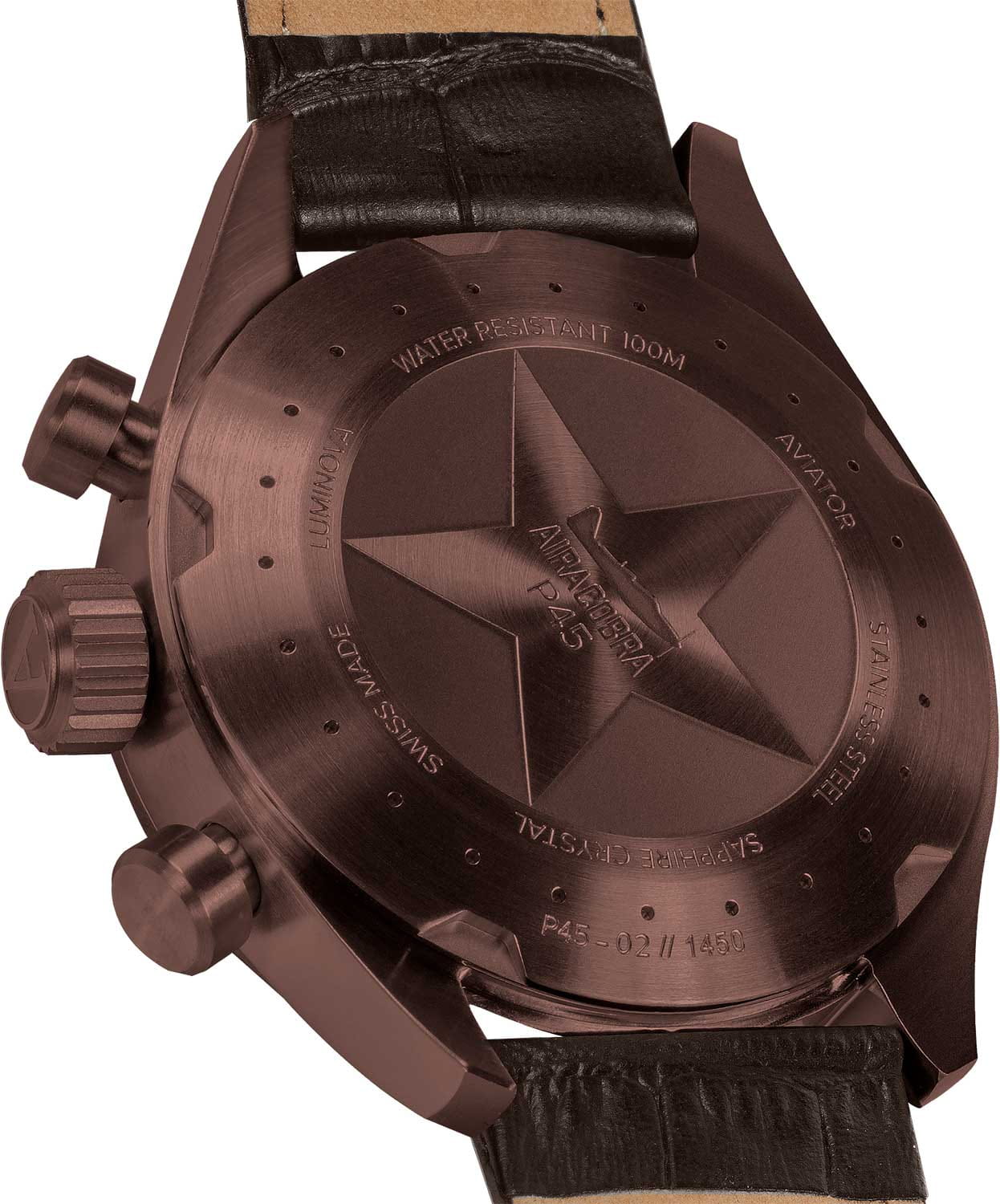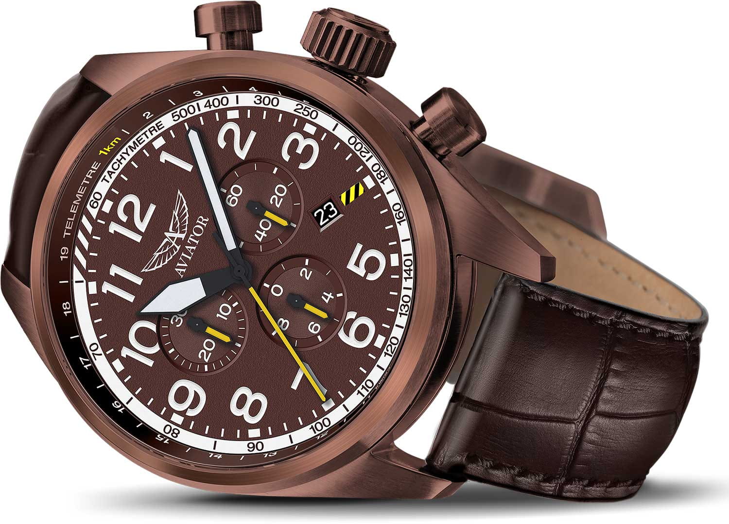 Aviator Airacobra P45 Chrono V.2.25.8.172.4  — швейцарские часы в духе пилотских инструментов, объединяющий точность, удобство и лаконичный дизайн. Диаметр корпуса — 45 мм, выполнен из нержавеющей стали 316L с PVD-покрытиемPVDУльтратонкое покрытие наносится в технике вакуумного напыления, сочетает в себе нитрид титана особой прочности со слоем золота или оксида хрома. Несёт в себе декоративную или защитную функцию., что подчёркивает техническую надёжность в образе часов. Циферблат оформлен в классическом aviator-стиле: крупные арабские цифры, широкие стрелки и чёткое деление минут позволяют считывать время мгновенно. Стрелки и метки покрыты люминесцентным покрытиемЛюминесцентное покрытиеПозволяет считывать показания времени в темноте. Производители наносят на стрелки, часовые индексы, безель или поверхность циферблата светонакопительный состав, дающий холодное свечение. Superluminova для отличной читаемости при слабом освещении. Циферблат защищён стойким сапфировым стекломСапфировое стеклоПрочный и надёжный материал из кристалла сапфира синтетического происхождения, характеризующийся особой твёрдостью и устойчивостью к царапинам и повреждениям. с антибликовым покрытиемАнтибликовое покрытиеСлой оксида металла в 0,13-0,3 микрон, благодаря которому стекло часов не бликует и не отражает свет. Антибликовое покрытие уменьшает отражение света в 10 раз, обеспечивая отличную читаемость показателей циферблата.. У модели присутствуют дата и точный откидной механизм завинчивающейся заводной головки и задней крышки, обеспечивающий надёжную водозащиту до 100 м и защиту от ударов. Внутри установлен швейцарский кварцевый механизм, который обеспечивает функции хронографаХронографФункция позволяет измерять отрезки времени с особой точностью: часы, минуты, секунды. Верным признаком хронографа является наличие на циферблате 3 дополнительных окошек-счётчиков.. Функции добавить (ADD) и разделить (SPLIT). Кожаный ремень со стандартной застежкой обеспечивает удобство и надёжную фиксацию. Эти изысканные часы так же обладают функциями тахиметраТахиметрРазмеченная шкала, располагается на ободке или безеле часов. Тахиметр позволяет рассчитать скорость на определённом участке пути, расстояние измеряется в километрах или милях., секундомераСекундомерСекундоме́р — прибор, способный измерять интервалы времени с точностью до долей секунды. и телеметра. Airacobra — это практичный и стильный инструмент для путешествий и активной повседневности, объединяющий авиационную эстетику, точный механизм и удобство.