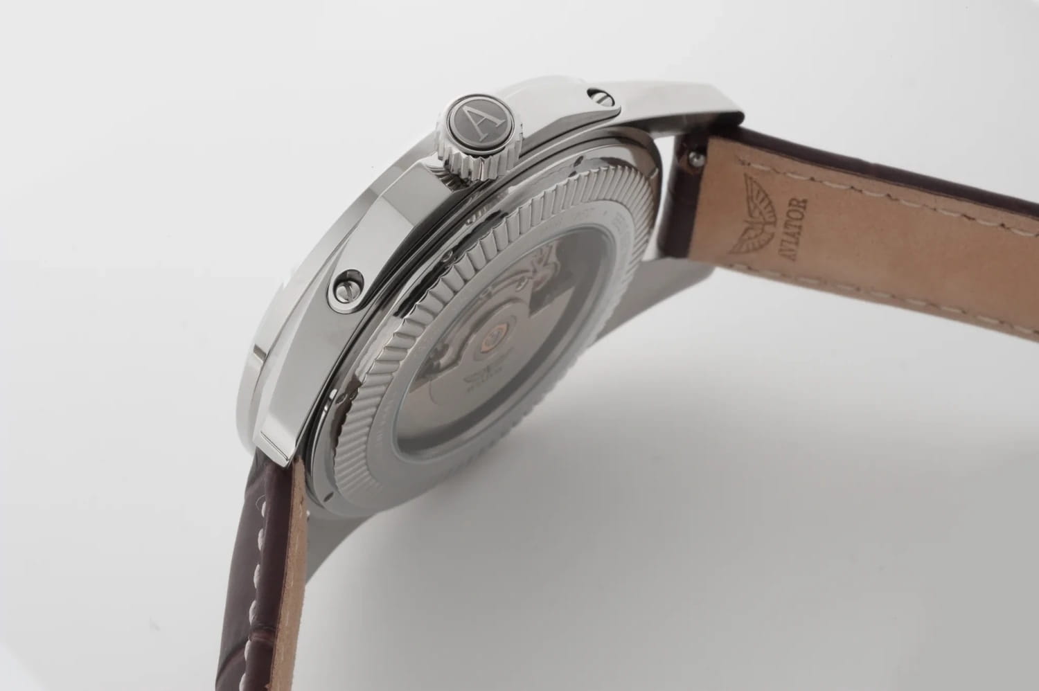 Aviator Airacobra V.3.39.0.341.4 — швейцарские часы в классике авиадизайна, сочетающие безупречную читаемость и высокую надёжность. Корпус диаметром 42,8 мм выполнен из нержавеющей стали 316L. Матовый циферблат с крупными арабскими цифрами, широкими стрелками и контрастной шкалой минут обеспечивает точную и быструю считываемость информации — как и положено настоящим пилотским часам. У отметки «3 часа» — окошко даты. Часовые метки и стрелки покрыты люминесцентным покрытиемЛюминесцентное покрытиеПозволяет считывать показания времени в темноте. Производители наносят на стрелки, часовые индексы, безель или поверхность циферблата светонакопительный состав, дающий холодное свечение. Superluminova, позволяющим легко определять время даже в тёмное время суток. Поверхность защищена прочным сапфировым стекломСапфировое стеклоПрочный и надёжный материал из кристалла сапфира синтетического происхождения, характеризующийся особой твёрдостью и устойчивостью к царапинам и повреждениям. с антибликовым покрытием, устойчивым к царапинам. Сердце модели — швейцарский механизм Sellita SW 200-1, известный своей точностью и долговечностью. Водозащита 100 метров, позволит плавать, нырять и заниматься другими водными видами спорта. Завинчивающаяся головка и задняя крышка обеспечивают уверенную ударопрочностьУдаропрочный корпусМеханизм заключён в корпус, выполненный из современных материалов, устойчивых к ударам, механическим повреждениям и падению с высоты: инновационный пластик, карбон, нержавеющая сталь, титан. и надёжную защиту от влаги и пыли. В механизме 26 камней, запас хода до 38 часов. Модель дополнена кожаным ремешком с выразительной текстурой и классическим стилем, закреплённым с помощью стандартной застежки — для максимального комфорта и лёгкости в повседневном использовании. Aviator — это образец лётной точности, инженерной чёткости и сдержанной роскоши, идеально подходящий для тех, кто ценит функциональность и уверенность в каждом элементе.