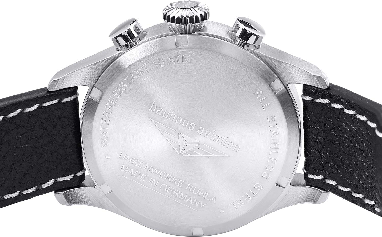 Мужские кварцевые часы-хронограф Bauhaus — это функциональный аксессуар в стиле авиационных приборов. Корпус диаметром 41 мм и толщиной 12 мм выполнен из стали с комбинированной матовой и полированной отделкой. Циферблат чёрного цвета оформлен арабскими цифрами и прямоугольными стрелками в стиле Baton. Присутствуют три субциферблата хронографа. Окошко даты расположено в положении 4 часов. Циферблат защищён прочным минеральным стекломМинеральное стеклоМинеральное стекло представляет собой искусственно выращенный минерал кварца. Такое стекло отличается особой устойчивостью к повреждениям и царапинам. Уступает по некоторым качествам сапфировому стеклу. K1. Механизм — швейцарский кварцевый калибр Ronda 5030.D с функциями хронографаХронографФункция позволяет измерять отрезки времени с особой точностью: часы, минуты, секунды. Верным признаком хронографа является наличие на циферблате 3 дополнительных окошек-счётчиков. и секундомераСекундомерСекундоме́р — прибор, способный измерять интервалы времени с точностью до долей секунды.. Рифлёная заводная головка конической формы украшена фирменным логотипом. Часы оснащены кожаным ремешком с декоративной белой строчкой и классической пряжкой. Водонепроницаемость 100 м позволяет использовать часы для плавания и повседневного ношения. Идеальный выбор для тех, кто ценит немецкое качество и спортивный дизайн.
