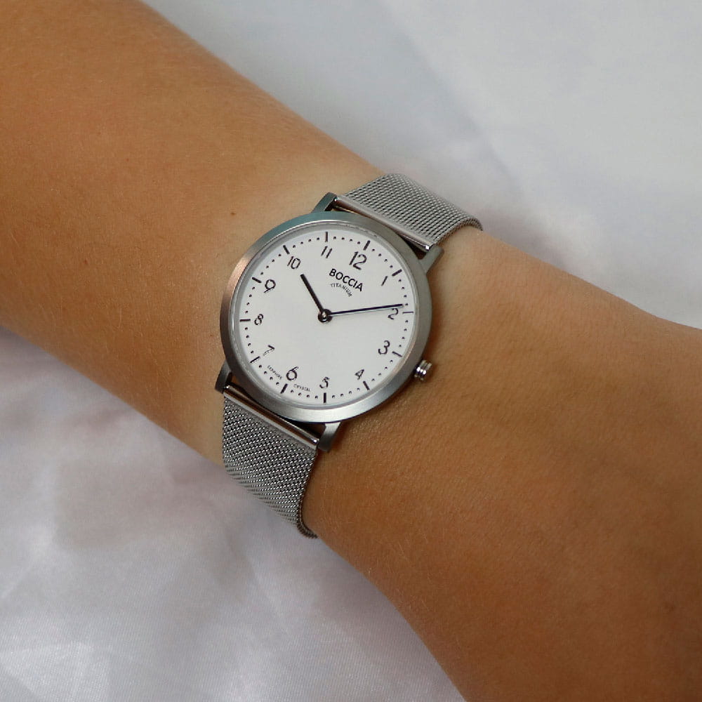 Женские наручные часы Boccia Titanium 3335-03 с надёжным кварцевым механизмом. Корпус часов изготовлен из титана. Сапфировое стеклоСапфировое стеклоПрочный и надёжный материал из кристалла сапфира синтетического происхождения, характеризующийся особой твёрдостью и устойчивостью к царапинам и повреждениям. устойчивое к мелким механическим повреждениям. Класс водозащиты: 50 метров, позволит защитить корпус от случайных брызг или капель дождя. Стальной браслет миланского плетения на раскладном замкеРаскладной замокДанный вариант застежки используется только на часах с металлическим браслетом. Отличительная особенность такого крепления в том, что длина браслета становится универсальной и вы можете самостоятельно отрегулировать нужный вам размер – застежка просто двигается по браслету часов..
