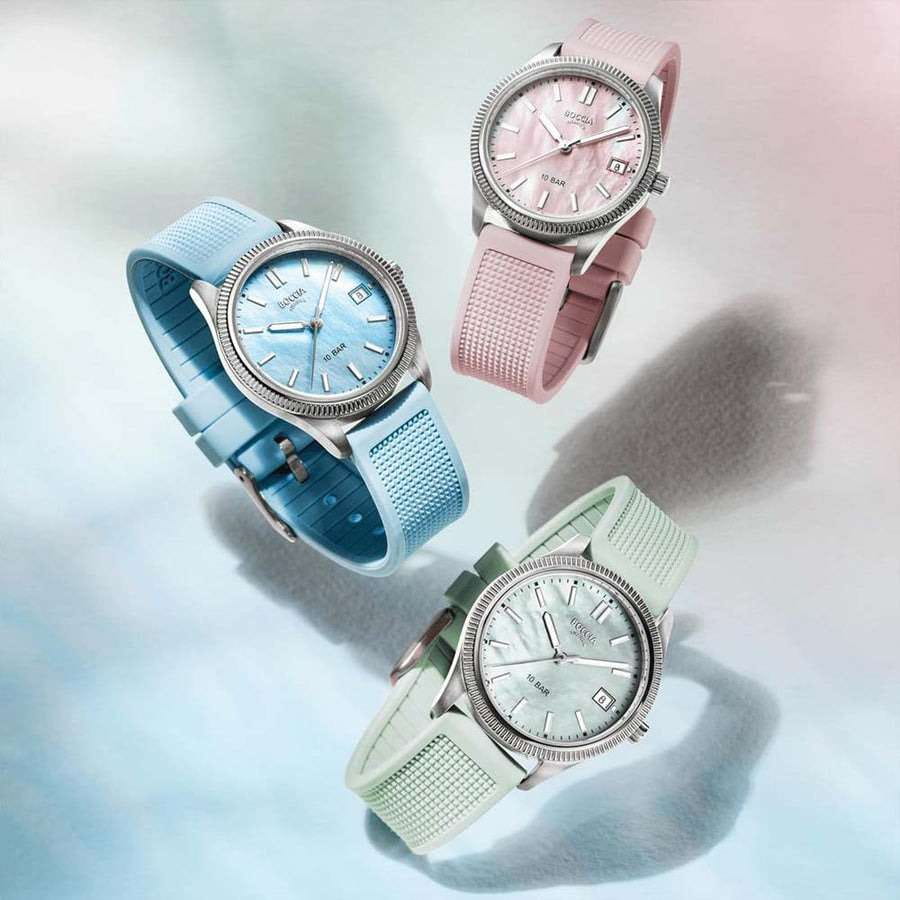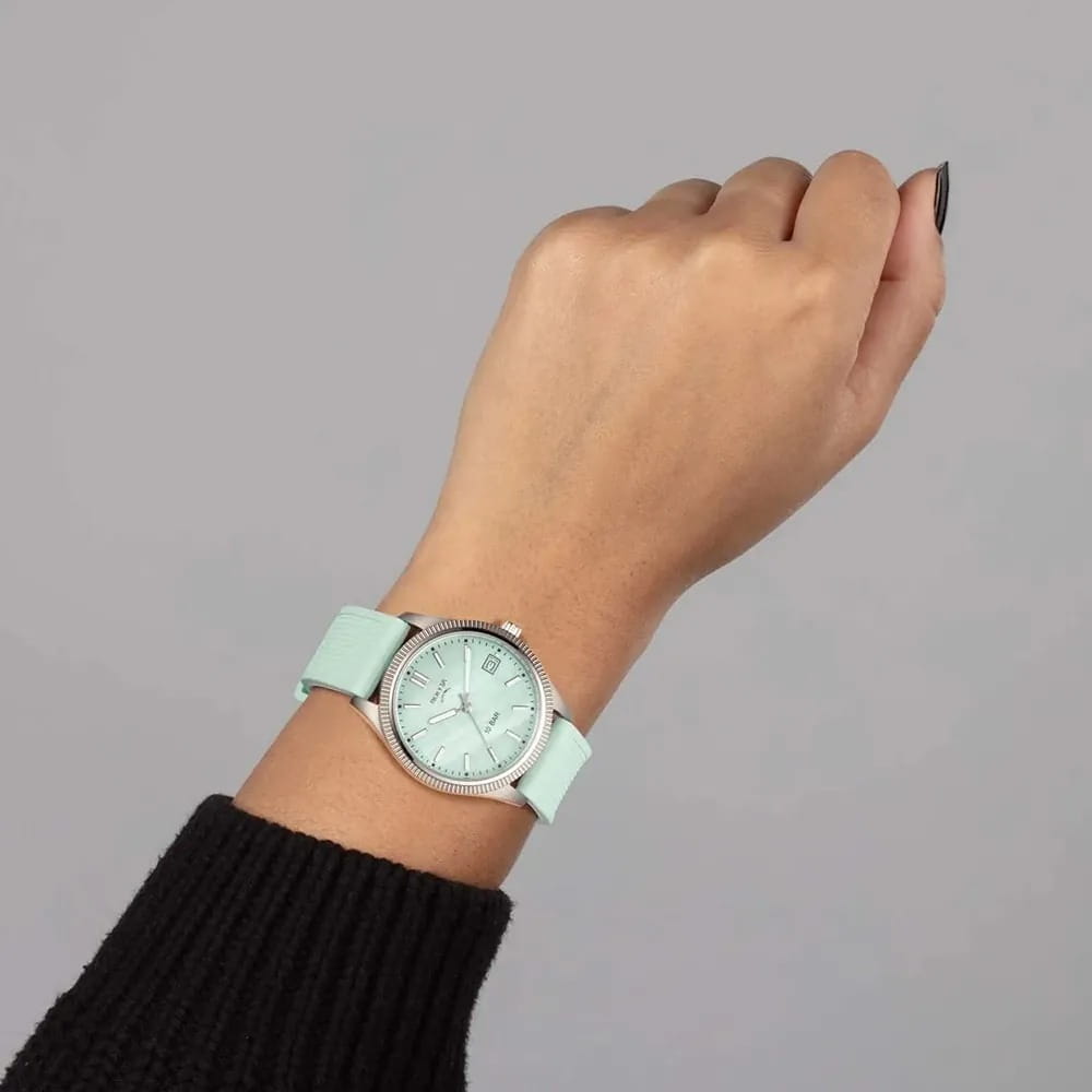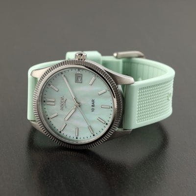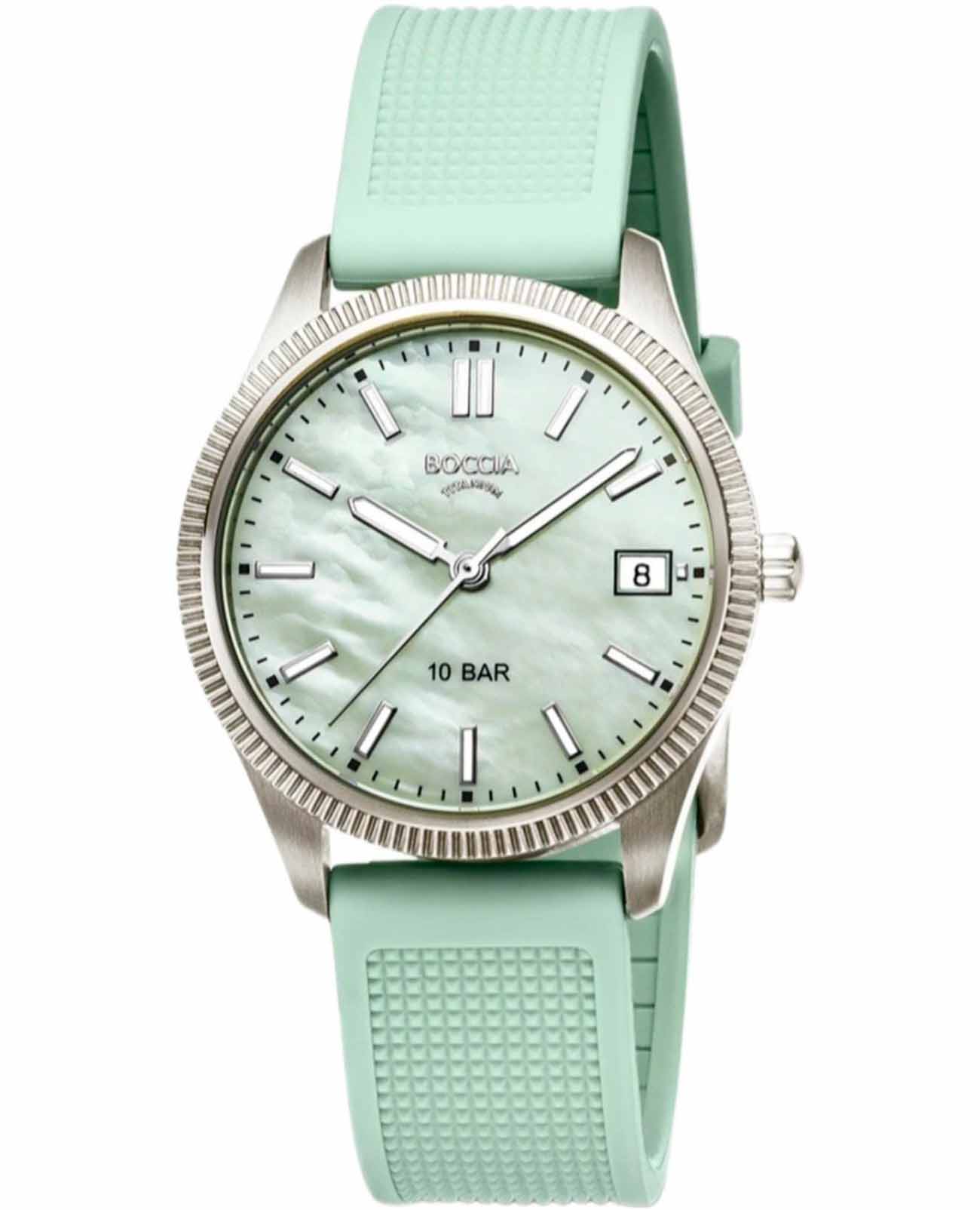 Boccia Titanium 3356-02 — эти женственные часы мгновенно привнесут нотку изысканности в любой ваш наряд! Легкий титановый корпус подчеркивает элегантность модели, а перламутровый зеленый циферблат с изящными штрихами-метками придает часам особый шарм. Стрелки и метки покрыты люминесцентным покрытиемЛюминесцентное покрытиеПозволяет считывать показания времени в темноте. Производители наносят на стрелки, часовые индексы, безель или поверхность циферблата светонакопительный состав, дающий холодное свечение., которое мягко светится в темноте, освещая путь даже в самых загадочных сумерках. Часы защищены прочным минеральным стекломМинеральное стеклоМинеральное стекло представляет собой искусственно выращенный минерал кварца. Такое стекло отличается особой устойчивостью к повреждениям и царапинам. Уступает по некоторым качествам сапфировому стеклу., устойчивым к мелким механическим повреждениям, что обеспечивает их долговечность и сохранение презентабельного вида. Окошко даты, расположенное на отметке 3 часа», всегда напомнит о важном событии дня. Завершающим аккордом служит мягкий каучуковый ремешок с классической застежкой, обеспечивающий комфорт и надежность в носке. 100 метров, позволит плавать, нырять и заниматься другими водными видами спорта.