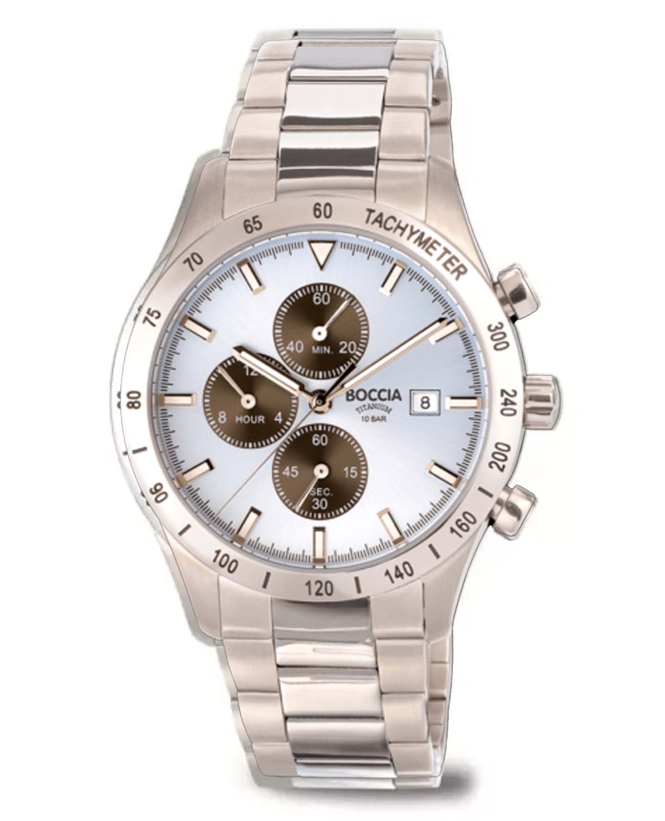 Мужские немецкие титановые часы-хронографХронографФункция позволяет измерять отрезки времени с особой точностью: часы, минуты, секунды. Верным признаком хронографа является наличие на циферблате 3 дополнительных окошек-счётчиков. с секундомеромСекундомерСекундоме́р — прибор, способный измерять интервалы времени с точностью до долей секунды. Boccia Titanium Circle-Oval 3739-01, кварцевый механизм с высокой точностью. Минеральное стеклоМинеральное стеклоМинеральное стекло представляет собой искусственно выращенный минерал кварца. Такое стекло отличается особой устойчивостью к повреждениям и царапинам. Уступает по некоторым качествам сапфировому стеклу. устойчивое к появлению царапин, обладающее высокой прозрачностью. Корпус изготовлен из титана. На цифрблате расположены три дополнительных индикатора и окошко даты в положении 3 часа. Стрелки с люминесцентным покрытиемЛюминесцентное покрытиеПозволяет считывать показания времени в темноте. Производители наносят на стрелки, часовые индексы, безель или поверхность циферблата светонакопительный состав, дающий холодное свечение.. Класс водозащиты100 метров, позволит плавать, нырять и заниматься другими водными видами спорта. Титановый браслет на раскладной застёжкеРаскладная застёжкаТакой тип застёжки используется только на браслетах из металла. Она никогда не раскрывается полностью, происходит разделение на 2 и более частей. Раскладывающая застёжка снизит вероятность потери часов к минимуму..