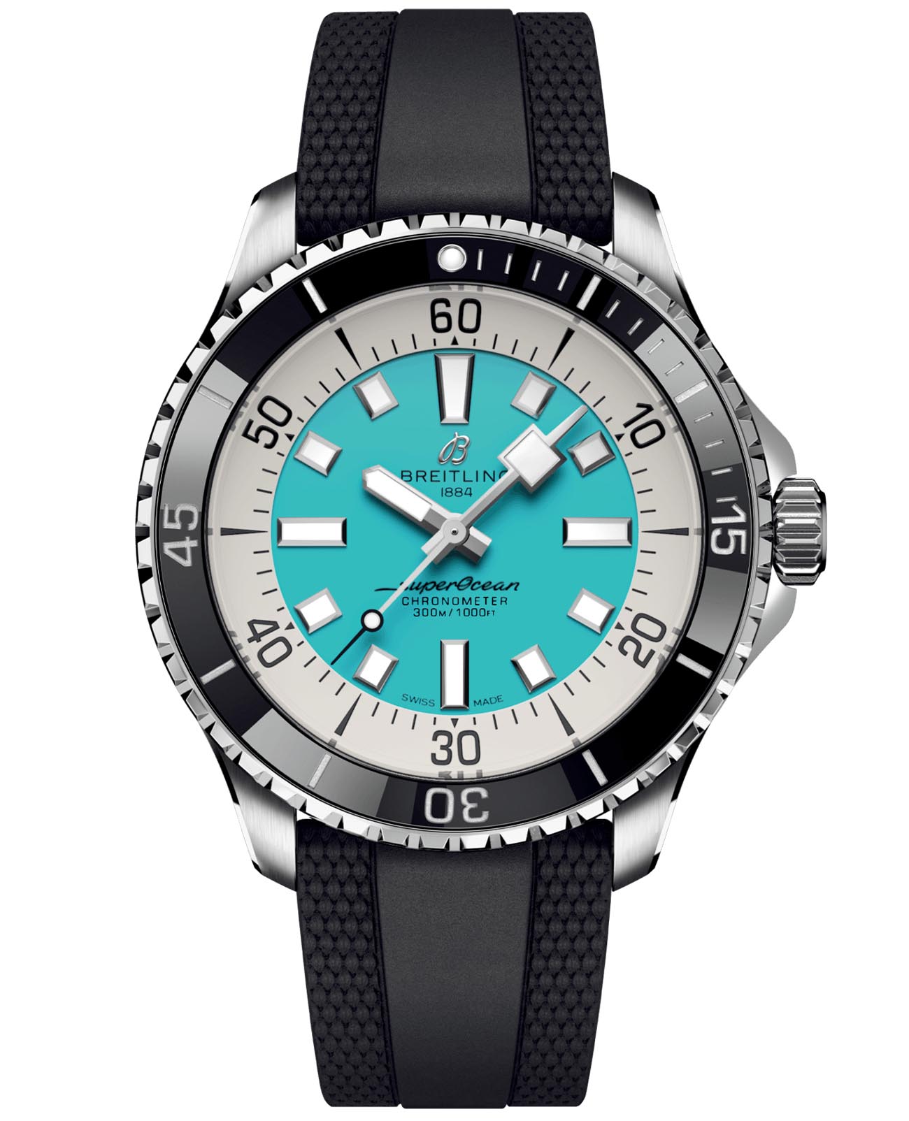 Мужские водонепроницаемые швейцарские часы Breitling Superocean Automatic 44 A17376211L2S1, механический механизм (автоматический калибр) с высокой точностью. Сапфировое стеклоСапфировое стеклоПрочный и надёжный материал из кристалла сапфира синтетического происхождения, характеризующийся особой твёрдостью и устойчивостью к царапинам и повреждениям. устойчивое к появлению царапин, обладающее высокой прозрачностью. Класс водозащиты: 300 метров, позволит плавать, нырять и заниматься другими водными видами спорта. Корпус часов изготовлен из стали. Силиконовый ремешок с раскладной застёжкойРаскладная застёжкаТакой тип застёжки используется только на браслетах из металла. Она никогда не раскрывается полностью, происходит разделение на 2 и более частей. Раскладывающая застёжка снизит вероятность потери часов к минимуму.. Стрелки и метки с люминесцентным покрытиемЛюминесцентное покрытиеПозволяет считывать показания времени в темноте. Производители наносят на стрелки, часовые индексы, безель или поверхность циферблата светонакопительный состав, дающий холодное свечение.. Широкие стрелки и индексы с люминесцентным покрытиемЛюминесцентное покрытиеПозволяет считывать показания времени в темноте. Производители наносят на стрелки, часовые индексы, безель или поверхность циферблата светонакопительный состав, дающий холодное свечение. обеспечивают легкую читаемость под водой. Этот специальный онлайн-эксклюзив Breitling отличается привлекательным голубым циферблатом. БезельБезельВнешний ободок, закрепляющий стекло. В спортивных часах так называется поворотное кольцо с делениями на циферблате, выполняет роль таймера – замеряет отрезки времени на шкале. Неподвижный безель – элемент декора. Однонаправленно вращающийся безель на дайверских часах позволяет фиксировать моменты погружения и выныривания на поверхность. из стали с керамической инкрустацией, защищенный от царапин, никогда не изнашивается и не выцветает. Лучше всего то, что это больше не просто часы для дайвинга — занимайтесь с ними серфингом, плавайте с ними, заходите с ними в пляжный бар, а затем надевайте их на ужин. Superocean идеально сочетает ностальгию по своему наследию со свежим внешним видом.