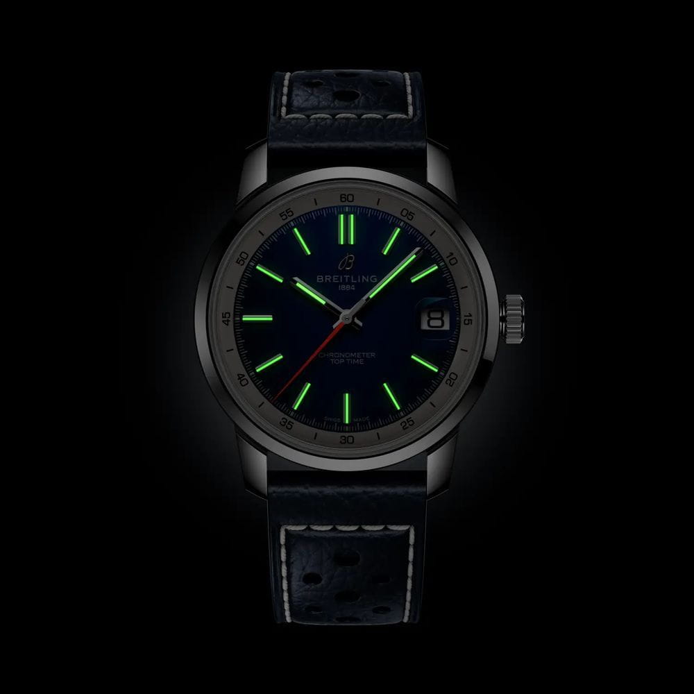 Breitling Top Time B31 AB3113A71C1X1 — стильная новинка 2025 года с характерной винтажной эстетикой и современным механизмом собственного производства. Корпус диаметром 38 мм выполнен из нержавеющей стали с полированной отделкой. Прозрачная задняя крышка позволяет наблюдать за работой механизма. Циферблат защищён выпуклым сапфировым стекломСапфировое стеклоПрочный и надёжный материал из кристалла сапфира синтетического происхождения, характеризующийся особой твёрдостью и устойчивостью к царапинам и повреждениям. с двухсторонним антибликовым покрытиемАнтибликовое покрытиеСлой оксида металла в 0,13-0,3 микрон, благодаря которому стекло часов не бликует и не отражает свет. Антибликовое покрытие уменьшает отражение света в 10 раз, обеспечивая отличную читаемость показателей циферблата.. Циферблат с контрастным внутренним кольцом и яркой оранжевой секундной стрелкой оформлен в узнаваемом стиле коллекции Top Time. Стрелки и часовые метки имеют люминесцентное покрытиеЛюминесцентное покрытиеПозволяет считывать показания времени в темноте. Производители наносят на стрелки, часовые индексы, безель или поверхность циферблата светонакопительный состав, дающий холодное свечение., обеспечивающее отличную читаемость. Внутри установлен автоматический калибр Breitling B31, отображающий часы, минуты, малую секунду и дату. Механизм обеспечивает запас хода до 78 часов и работает с частотой 28 800 полуколебаний в час. Часы укомплектованы перфорированным кожаным ремешком и классической застёжкой-пряжкой. Водонепроницаемость 100 метров делает модель универсальной для повседневного использования. Top Time B31 AB3113A71C1X1 — гармония винтажного дизайна и инновационного часового мастерства.