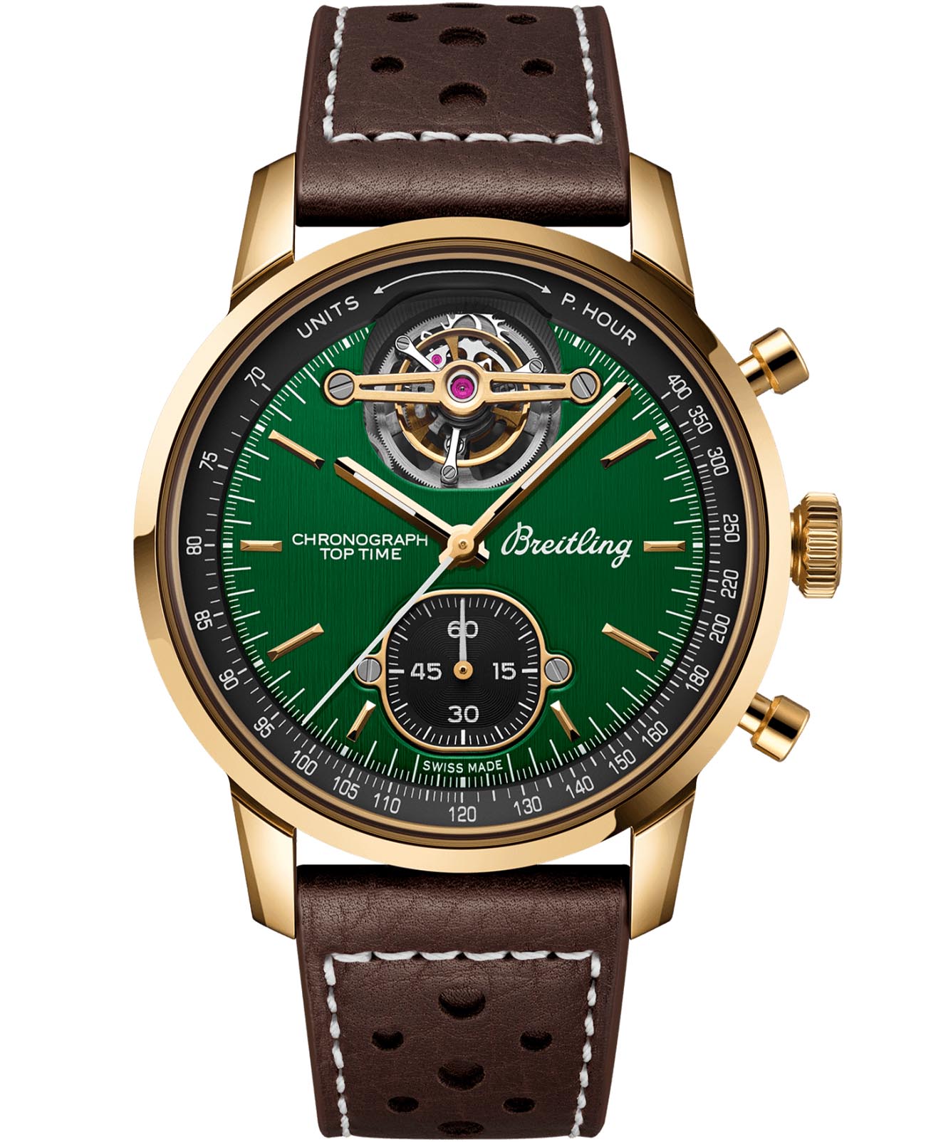 Мужские наручные часы c хронографомХронографФункция позволяет измерять отрезки времени с особой точностью: часы, минуты, секунды. Верным признаком хронографа является наличие на циферблате 3 дополнительных окошек-счётчиков. Breitling Top Time B21 Ford Mustang NB21251A1L1X1, надежный автоматический механизм. Корпус часов изготовлен из бронзы. Практичный кожаный ремешок на стандартной застёжке. ТахиметрТахиметрРазмеченная шкала, располагается на ободке или безеле часов. Тахиметр позволяет рассчитать скорость на определённом участке пути, расстояние измеряется в километрах или милях., сапфировое стеклоСапфировое стеклоПрочный и надёжный материал из кристалла сапфира синтетического происхождения, характеризующийся особой твёрдостью и устойчивостью к царапинам и повреждениям. повышенной прозрачности, устойчивое к мелким механическим повреждениям. Стрелки и метки с люминесцентным покрытиемЛюминесцентное покрытиеПозволяет считывать показания времени в темноте. Производители наносят на стрелки, часовые индексы, безель или поверхность циферблата светонакопительный состав, дающий холодное свечение..