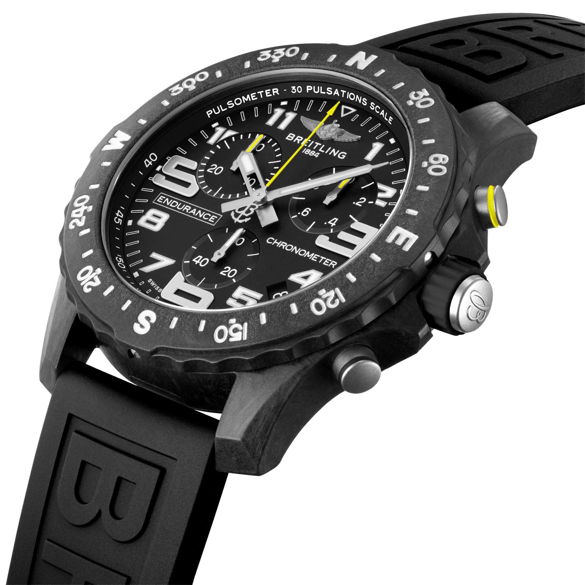 Швейцарские спортивные часы-хронографХронографФункция позволяет измерять отрезки времени с особой точностью: часы, минуты, секунды. Верным признаком хронографа является наличие на циферблате 3 дополнительных окошек-счётчиков. с секундомеромСекундомерСекундоме́р — прибор, способный измерять интервалы времени с точностью до долей секунды. Breitling Endurance Pro X82310E51B1S1, кварцевый механизм с высокой точностью. Разработанные как легкие часы для спортсменов, так и повседневный спортивный хронограф Endurance Pro идеально сочетают высокую точность и инновационные технологии с ярким и красочным дизайном. Сапфировое стеклоСапфировое стеклоПрочный и надёжный материал из кристалла сапфира синтетического происхождения, характеризующийся особой твёрдостью и устойчивостью к царапинам и повреждениям. с антибликовым покрытием устойчивое к появлению царапин, обладающее высокой прозрачностью. Класс водозащиты: 100 метров, позволит плавать, нырять и заниматься другими водными видами спорта. Корпус часов изготовлен из уникального материала Breitlight®, который в 3,3 раза легче титана и в 5,8 раза легче нержавеющей стали. Немагнитный, термостойкий и гипоаллергенный материал Breitlight ® обладает высокой устойчивостью к царапинам, сцеплению и коррозии. Стрелки и метки с люминесцентным покрытиемЛюминесцентное покрытиеПозволяет считывать показания времени в темноте. Производители наносят на стрелки, часовые индексы, безель или поверхность циферблата светонакопительный состав, дающий холодное свечение.. Силиконовый ремешок на стандартной застёжке. Часы имеют сертификат COSCСертификат COSCОфициальный сертификат, подтверждающий то, что часы ходят с особо высокой точностью. Для получения документа часы подвергаются тестовым испытаниям, разработанным швейцарским институтом тестирования хронометров COSC. Допустимая норма для механических часов -4/+6 секунд в день, для кварцевых моделей +/- 0,07 секунд в день.. Двунаправленный безельБезельВнешний ободок, закрепляющий стекло. В спортивных часах так называется поворотное кольцо с делениями на циферблате, выполняет роль таймера – замеряет отрезки времени на шкале. Неподвижный безель – элемент декора. Однонаправленно вращающийся безель на дайверских часах позволяет фиксировать моменты погружения и выныривания на поверхность. с выгравированной шкалой компаса.