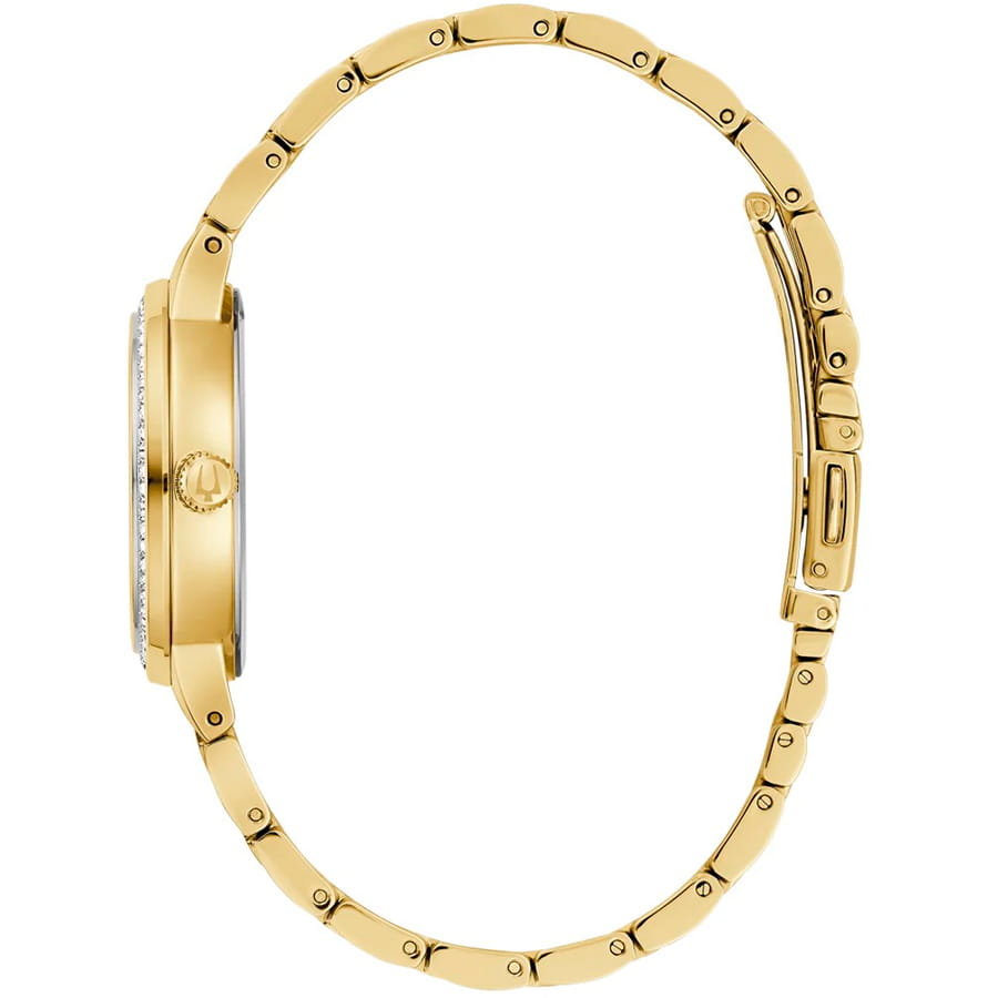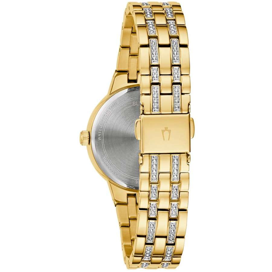 Женские кварцевые часы Bulova Crystal Ladies 97L176 – отражающий идеальное сочетание современного дизайна, надёжности и функциональности. Элегантный облик станет превосходным завершением образа, наделив его индивидуальным характером. Корпус из нержавеющей стали с IP-покрытиемIP-покрытиеМетод ионного напыления. Демонстрирует повышенную устойчивость к истиранию, окислению и химическим веществам. Под воздействием высокого давления и температуры около 1500°C молекулы металла надёжно соединяются с частицами корпуса часов., диаметром 32 мм идеально сбалансирован и элегантен. Минеральное стеклоМинеральное стеклоМинеральное стекло представляет собой искусственно выращенный минерал кварца. Такое стекло отличается особой устойчивостью к повреждениям и царапинам. Уступает по некоторым качествам сапфировому стеклу. защищает циферблат от царапин и устойчивое к мелким механическим повреждениям. БезельБезельВнешний ободок, закрепляющий стекло. В спортивных часах так называется поворотное кольцо с делениями на циферблате, выполняет роль таймера – замеряет отрезки времени на шкале. Неподвижный безель – элемент декора. Однонаправленно вращающийся безель на дайверских часах позволяет фиксировать моменты погружения и выныривания на поверхность. и браслет украшены 120 кристаллами Swarovski. Стальной браслет на раскладной застёжкеРаскладная застёжкаТакой тип застёжки используется только на браслетах из металла. Она никогда не раскрывается полностью, происходит разделение на 2 и более частей. Раскладывающая застёжка снизит вероятность потери часов к минимуму. с IP-покрытиемIP-покрытиеМетод ионного напыления. Демонстрирует повышенную устойчивость к истиранию, окислению и химическим веществам. Под воздействием высокого давления и температуры около 1500°C молекулы металла надёжно соединяются с частицами корпуса часов. обеспечивает комфортное ношение. Водозащита 30 метров позволит защитить корпус от случайных брызг или капель дождя. Эта модель – отличный выбор для тех, кто ищет сочетание стиля, качества и функциональности. Часы станут не только полезным аксессуаром, но и выразительным элементом вашего имиджа.