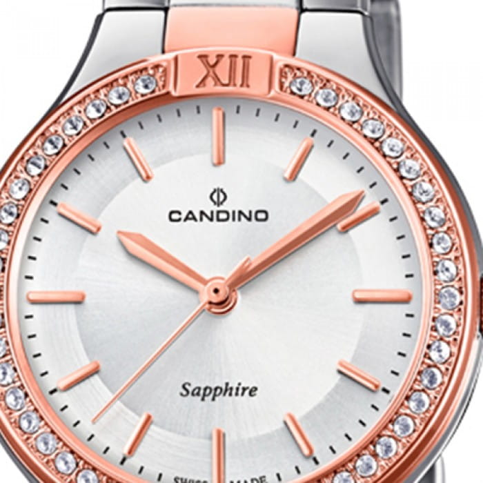 Женские швейцарские часы с кристаллами на безелеБезельВнешний ободок, закрепляющий стекло. В спортивных часах так называется поворотное кольцо с делениями на циферблате, выполняет роль таймера – замеряет отрезки времени на шкале. Неподвижный безель – элемент декора. Однонаправленно вращающийся безель на дайверских часах позволяет фиксировать моменты погружения и выныривания на поверхность. Candino Lady Petite C4628/1, кварцевый механизм с высокой точностью. Сапфировое стеклоСапфировое стеклоПрочный и надёжный материал из кристалла сапфира синтетического происхождения, характеризующийся особой твёрдостью и устойчивостью к царапинам и повреждениям. устойчивое к появлению царапин, обладающее высокой прозрачностью. Класс водозащиты: 50 метров, позволит защитить корпус от случайных брызг или капель дождя. Корпус и браслет часов изготовлены из стали с PVD-покрытиемPVDУльтратонкое покрытие наносится в технике вакуумного напыления, сочетает в себе нитрид титана особой прочности со слоем золота или оксида хрома. Несёт в себе декоративную или защитную функцию.. Браслет с раскладной застёжкойРаскладная застёжкаТакой тип застёжки используется только на браслетах из металла. Она никогда не раскрывается полностью, происходит разделение на 2 и более частей. Раскладывающая застёжка снизит вероятность потери часов к минимуму..