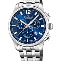 Швейцарские мужские наручные часы-хронографХронографФункция позволяет измерять отрезки времени с особой точностью: часы, минуты, секунды. Верным признаком хронографа является наличие на циферблате 3 дополнительных окошек-счётчиков. Candino Chronograph C4744/2, кварцевый механизм с высокой точностью. Сапфировое стеклоСапфировое стеклоПрочный и надёжный материал из кристалла сапфира синтетического происхождения, характеризующийся особой твёрдостью и устойчивостью к царапинам и повреждениям. устойчивое к появлению царапин, обладающее высокой прозрачностью. Часы, минуты, секунды. Окошко даты находится в положении между 4 и 5 часов. Класс водозащиты: 100 метров, позволит плавать, нырять и заниматься другими водными видами спорта. Раскладная застёжкаРаскладная застёжкаТакой тип застёжки используется только на браслетах из металла. Она никогда не раскрывается полностью, происходит разделение на 2 и более частей. Раскладывающая застёжка снизит вероятность потери часов к минимуму. с фиксатором. Корпус часов изготовлен из нержавеющей стали. Стрелки и метки с люминесцентным покрытиемЛюминесцентное покрытиеПозволяет считывать показания времени в темноте. Производители наносят на стрелки, часовые индексы, безель или поверхность циферблата светонакопительный состав, дающий холодное свечение..