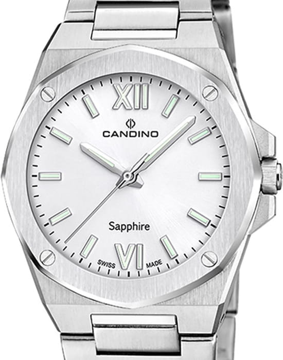 Женские швейцарские часы с сапфировым стекломСапфировое стеклоПрочный и надёжный материал из кристалла сапфира синтетического происхождения, характеризующийся особой твёрдостью и устойчивостью к царапинам и повреждениям. Candino Quartz C4775/1, кварцевый механизм с высокой точностью. Сапфировое стеклоСапфировое стеклоПрочный и надёжный материал из кристалла сапфира синтетического происхождения, характеризующийся особой твёрдостью и устойчивостью к царапинам и повреждениям. устойчивое к появлению царапин, обладающее высокой прозрачностью. Класс водозащиты: 100 метров, позволит плавать, нырять и заниматься другими водными видами спорта. Корпус часов изготовлен из стали. Браслет с раскладной застёжкойРаскладная застёжкаТакой тип застёжки используется только на браслетах из металла. Она никогда не раскрывается полностью, происходит разделение на 2 и более частей. Раскладывающая застёжка снизит вероятность потери часов к минимуму.. Стрелки с люминесцентным покрытиемЛюминесцентное покрытиеПозволяет считывать показания времени в темноте. Производители наносят на стрелки, часовые индексы, безель или поверхность циферблата светонакопительный состав, дающий холодное свечение..