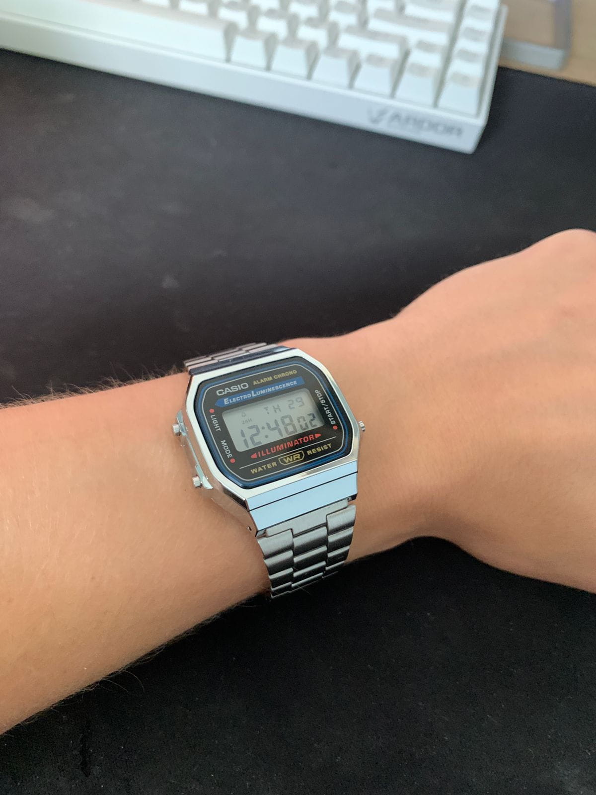 Люблю носить часы и являюсь фанатом фирмы Casio. В какой-то момент надумал купить очередную пару часов и что-нибудь из моды 80-х, тем более что сейчас эта мода возвращается. Выбор пал на данную модель. Презентабельный вид, лёгкие; очень нравится металлическая застёжка и рельефный логотип Casio на ней. Ощущение качественной сборки. На задней крышке выбит номер модуля часов и др. информация (мелочь, а приятно!). Люминисцентная подсветка - приятный голубоватый свет, равномерно распределяющийся по всей поверхности дисплея - это вам не лампа накаливания, бьющая откуда-то из угла дисплея жёлтым светом, которая к тому же нехило жрёт батарею. Несколько разочаровывает пищалка - ожидал более приятной тональности, мои G-Shock'и звучат явно приятнее. За какие-то 1 700 рублей, которые эти часы стоят в Москве, вы получаете хорошую вещь, соотношение цена / качество которой приятно поражает. Это настоящая классика на все времена, которая даже в эпоху смартфонов будет иметь своего потребителя. Плюс качество Casio, которое из года в год, из десятилетия в десятилетие остаётся неизменно высоким.
