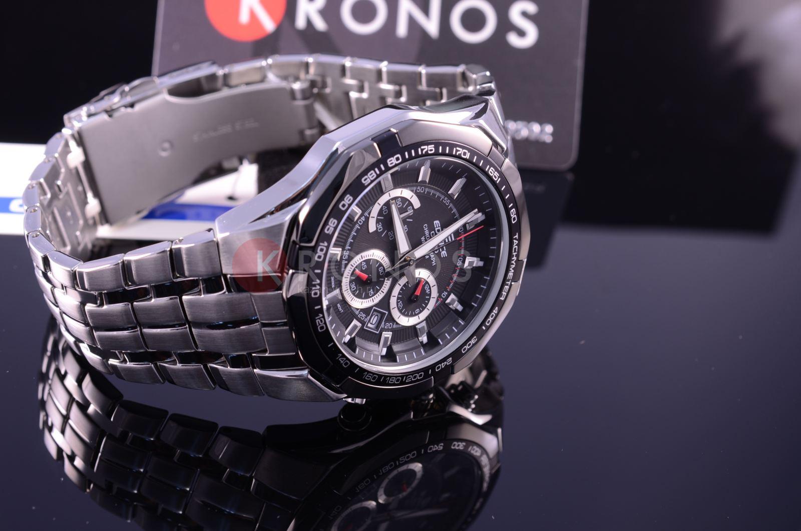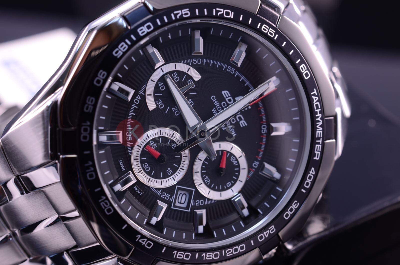 Стильный мужские наручные часы Casio Edifice надежные и практичные. Кварцевый японский механизм Miyota. Точность хода не хуже -10 +15 сек./в месяц. Часы оснащены функцией хронографа и тахиметра. Циферблат черного цвета с контрастными индексами. Безель с IP покрытием черного цвета. Стрелки и индексы с светонакопительным нанесением. Корпус и браслет выполнены из высококачественной стали с антикоррозийными свойствами. Минеральное стекло устойчиво к появлению царапин. Водонепроницаемость 100М. В часах можно плавать.