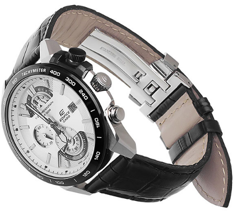 Кварцевый японский механизм Miyota. Точность хода не хуже -10 +15 сек./в месяц.Часы оснащены функцией хронографа. Циферблат белого цвета с контрастными элементами дизайна. Стрелки и индексы с светонакопительным нанесением. Корпус выполнен из нержавеющей стали с частичным. Ремешок из натуральной кожи, черного цвета, с удобной застежкой. Минеральное стекло устойчиво к появлению царапин. Водонепроницаемость 100М. В часах можно плавать. Степень водонепроницаемости не является величиной, эквивалентной функциональной рабочей глубине.
