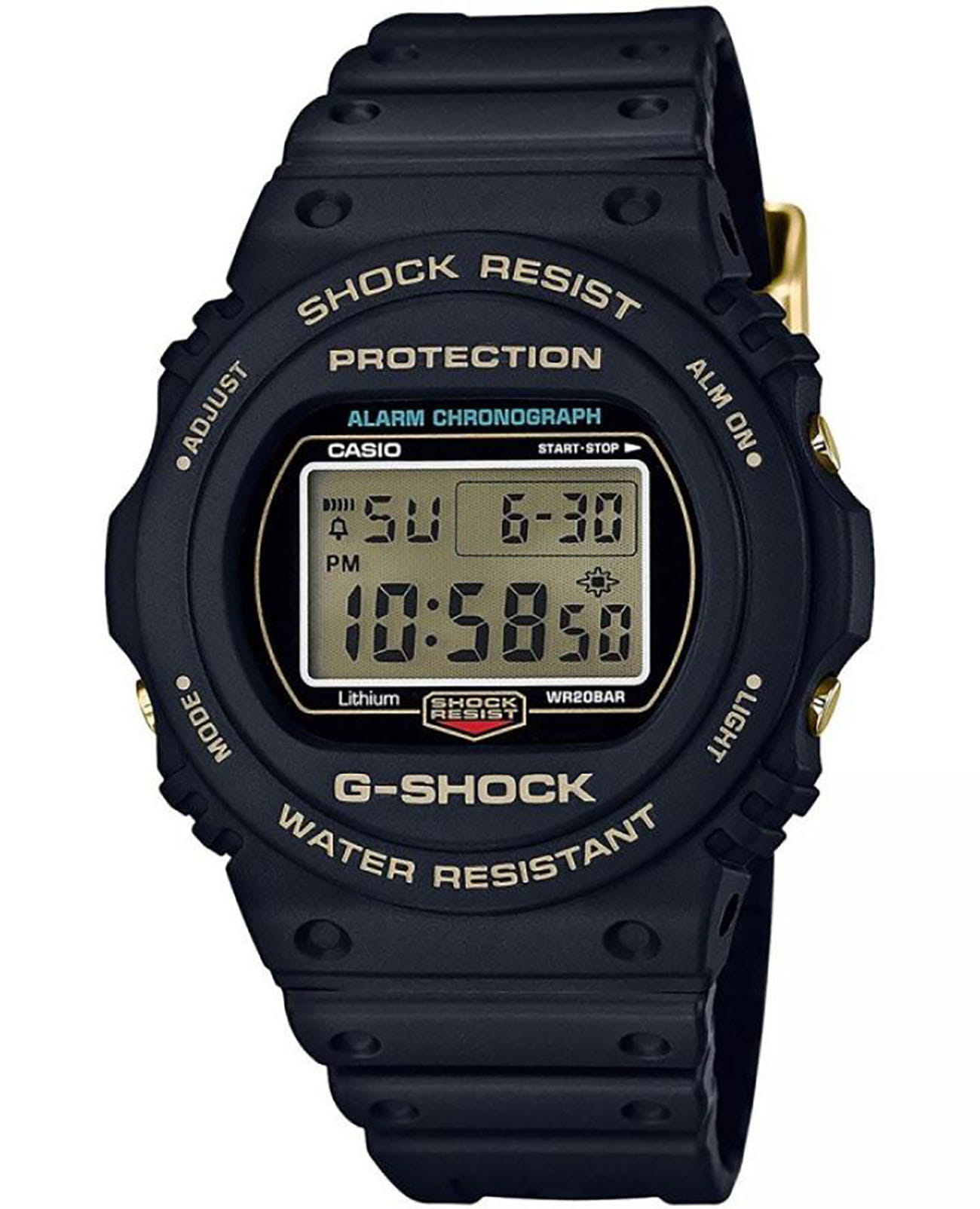 Ностальгические наручные часы в чёрном цвете дополнены металлическими деталями, имеющими роскошный золотой оттенок, завинчивающаяся задняя крышка украшена гравировкой. Премиальный аксессуар, выпущенный ограниченным тиражом, имеет ударопрочный корпусУдаропрочный корпусМеханизм заключён в корпус, выполненный из современных материалов, устойчивых к ударам, механическим повреждениям и падению с высоты: инновационный пластик, карбон, нержавеющая сталь, титан. из пластика, устойчивый к повреждениям, вибрации, падению с высоты, ремешок из полимерного материала обеспечивает комфортное ношение. Японский кварцевый механизм с точностью хода +/- 15 секунд в месяц. Срок службы батарейки составляет 2 года. Электролюминесцентная подсветкаЭлектролюминесцентная подсветкаЭлектролюминесцентная панель устанавливается под ЖК-экраном часов, при нажатии кнопки электричество преобразуется в свет за счёт подачи напряжения на атомы фосфора, такой тип подсветки позволяет освещать весь циферблат.. Минеральное стекло устойчиво к царапинам. Водонепроницаемость до 20 бар. Будильник, таймер с автоповтором, секундомер, календарь до 2099 года, хронографХронографФункция позволяет измерять отрезки времени с особой точностью: часы, минуты, секунды. Верным признаком хронографа является наличие на циферблате 3 дополнительных окошек-счётчиков.. 12-ти и 24-х часовой формат времени. Габариты: 48,9 x 45,4 x 14,2 мм.
