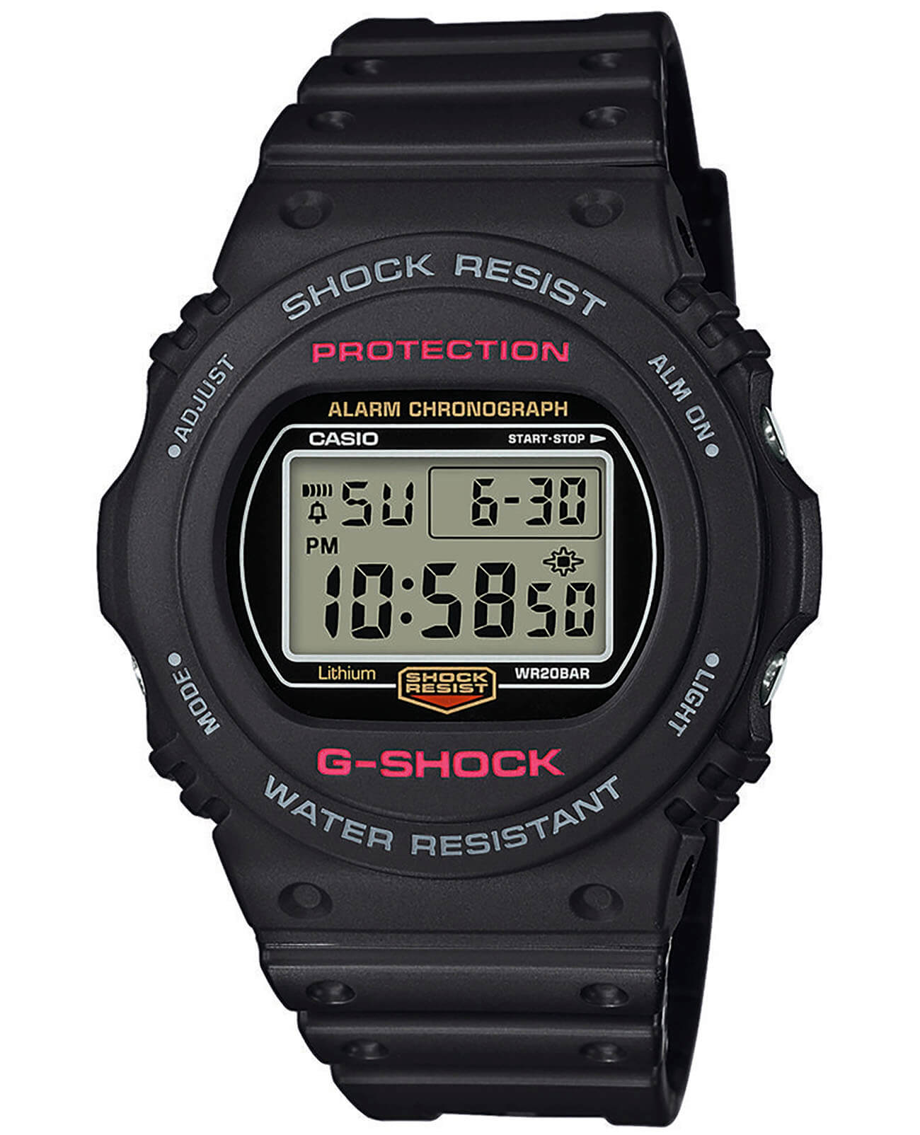 Аксессуар позволит экспериментировать с разными стилями в одежде благодаря классическому чёрному исполнению с матовой поверхностью и розовыми деталями. Внешний вид оставлен «ностальгическим», создатели делают ставку на высокое качество материалов и функционал. Модель наделена ударопрочным корпусомУдаропрочный корпусМеханизм заключён в корпус, выполненный из современных материалов, устойчивых к ударам, механическим повреждениям и падению с высоты: инновационный пластик, карбон, нержавеющая сталь, титан. из полимерного материала, который выдерживает удары, повреждения, вибрации. Японский кварцевый калибр с точностью хода -/+15 секунд в месяц. Батарейка рассчитана на 2 года работы. Электролюминесцентная подсветкаЭлектролюминесцентная подсветкаЭлектролюминесцентная панель устанавливается под ЖК-экраном часов, при нажатии кнопки электричество преобразуется в свет за счёт подачи напряжения на атомы фосфора, такой тип подсветки позволяет освещать весь циферблат. циферблата. Минеральное стеклоМинеральное стеклоМинеральное стекло представляет собой искусственно выращенный минерал кварца. Такое стекло отличается особой устойчивостью к повреждениям и царапинам. Уступает по некоторым качествам сапфировому стеклу.. Водостойкость 20 бар. Комфортный полимерный ремешок. 12/24-часовой формат отображения времени. БудильникБудильникБуди́льник — часы, в заданный момент времени подающие звуковой, световой и/или в редких случаях другой сигнал. со световым сигналом, таймерТаймерОтсчитывает секунды в обратном направлении в заданном интервале времени., секундомерСекундомерСекундоме́р — прибор, способный измерять интервалы времени с точностью до долей секунды., хронографХронографФункция позволяет измерять отрезки времени с особой точностью: часы, минуты, секунды. Верным признаком хронографа является наличие на циферблате 3 дополнительных окошек-счётчиков., автоматический календарь. Габариты: 45,4 x 48,9 x 13,4 мм.