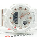 Аксессуар в белоснежном исполнении с цветовыми акцентами цвета розового золота стильно смотрится на запястье и подойдёт к любой одежде. Модель оснащена дополнительными усложнениями, помогающими повысить эффективность тренировок: трекер активности измеряет количество шагов от 0 до 999999, секундомер с памятью на 200 результатов, мультифункциональный таймер. Данные можно хранить и анализировать в специальном приложении для смартфонов G-Shock Connected App, чему способствует технология Bluetooth 4.0BluetoothСовременная технология, позволяющая синхронизировать часы с телефоном и переносить данные. Часы с Bluetooth расширяют возможности вашего смартфона и делают его использование ещё более удобным.. Японский кварцевый механизм работает от батарейки, срок её службы составляет 2 года. Минеральное стекло противостоит появлению царапин. Светодиодная подсветкаСветодиодная подсветкаСветодиодная или LED-подсветка обеспечивает появление яркого холодного свечения за счёт LED-элементов - маленьких лампочек. Они потребляют минимальное количество энергии, чаще всего можно встретить 1 светодиод, в нижней части циферблата.. Водонепроницаемость 200 метров. Противоударный корпусУдаропрочный корпусМеханизм заключён в корпус, выполненный из современных материалов, устойчивых к ударам, механическим повреждениям и падению с высоты: инновационный пластик, карбон, нержавеющая сталь, титан. и гибкий ремешок из полимерного материала. ХронографХронографФункция позволяет измерять отрезки времени с особой точностью: часы, минуты, секунды. Верным признаком хронографа является наличие на циферблате 3 дополнительных окошек-счётчиков., будильник, мировое времяМировое время Полезное часовое усложнение, отображающее время в основных городах и известных областях по всему миру, оно связано с часовыми поясами, удобно для путешественников и бизнесменов. , автоматический календарь до 2099 года. Габариты: 50,7 x 45,2 x 15,5 мм.