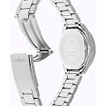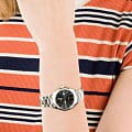Сдержанный цветовой дизайн модели выдержан в серебристом и черном цвете. Стальной браслет имеет раскладывающуюся застежку, состоит из нескольких звеньев и прочно закреплен с корпусом из латуни. Аккуратные временные отметки сделаны в виде штрихов. На стрелки нанесено светящееся необритовое покрытие. В качестве полезной особенности на циферблате имеется календарь. Водонепроницаемость часов равна 50WR. Тип механизма — кварцевый.