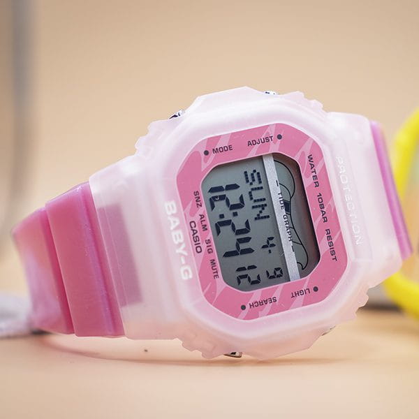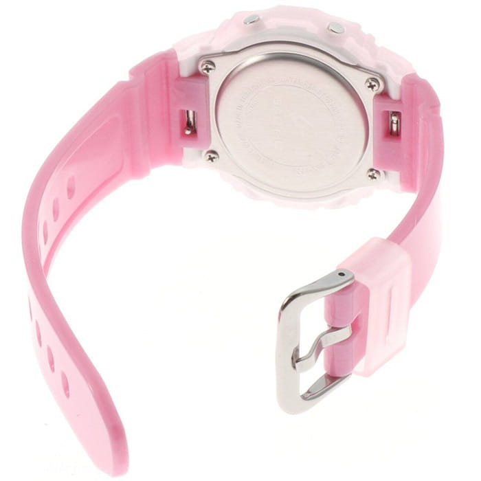 Женские японские часы-хронографХронографФункция позволяет измерять отрезки времени с особой точностью: часы, минуты, секунды. Верным признаком хронографа является наличие на циферблате 3 дополнительных окошек-счётчиков. Casio Baby-G BLX-565S-4E, кварцевый механизм с высокой точностью. Класс водозащиты: 100 метров, позволит плавать, нырять и заниматься другими водными видами спорта. Корпус часов изготовлен из пластика розового цвета. Ударопрочный корпусУдаропрочный корпусМеханизм заключён в корпус, выполненный из современных материалов, устойчивых к ударам, механическим повреждениям и падению с высоты: инновационный пластик, карбон, нержавеющая сталь, титан. защищает механизм от ударов и вибрации. Светодиодная подсветкаСветодиодная подсветкаСветодиодная или LED-подсветка обеспечивает появление яркого холодного свечения за счёт LED-элементов - маленьких лампочек. Они потребляют минимальное количество энергии, чаще всего можно встретить 1 светодиод, в нижней части циферблата. освещает весь циферблат, после отпускания кнопки свечение продолжается еще некоторое время. Особенность модели в функциях будильникаБудильникБуди́льник — часы, в заданный момент времени подающие звуковой, световой и/или в редких случаях другой сигнал., секундомераСекундомерСекундоме́р — прибор, способный измерять интервалы времени с точностью до долей секунды., таймераТаймерОтсчитывает секунды в обратном направлении в заданном интервале времени. и мирового времениМировое время Полезное часовое усложнение, отображающее время в основных городах и известных областях по всему миру, оно связано с часовыми поясами, удобно для путешественников и бизнесменов. . Циферблат подсвечивается ярким светодиодомСветодиодная подсветкаСветодиодная или LED-подсветка обеспечивает появление яркого холодного свечения за счёт LED-элементов - маленьких лампочек. Они потребляют минимальное количество энергии, чаще всего можно встретить 1 светодиод, в нижней части циферблата.. Послесвечение. Цвет подсветки: белый. Отображение возраста и фазы Луны. Отображение сведений о приливах и отливах на заданную дату и время. 12-ти и 24-х часовой формат времени. Функции включения/отключения летнего времени и включения/отключения звука. Батарея рассчитана на 3 года. Задняя крышка крепится на 4-х винтах.
