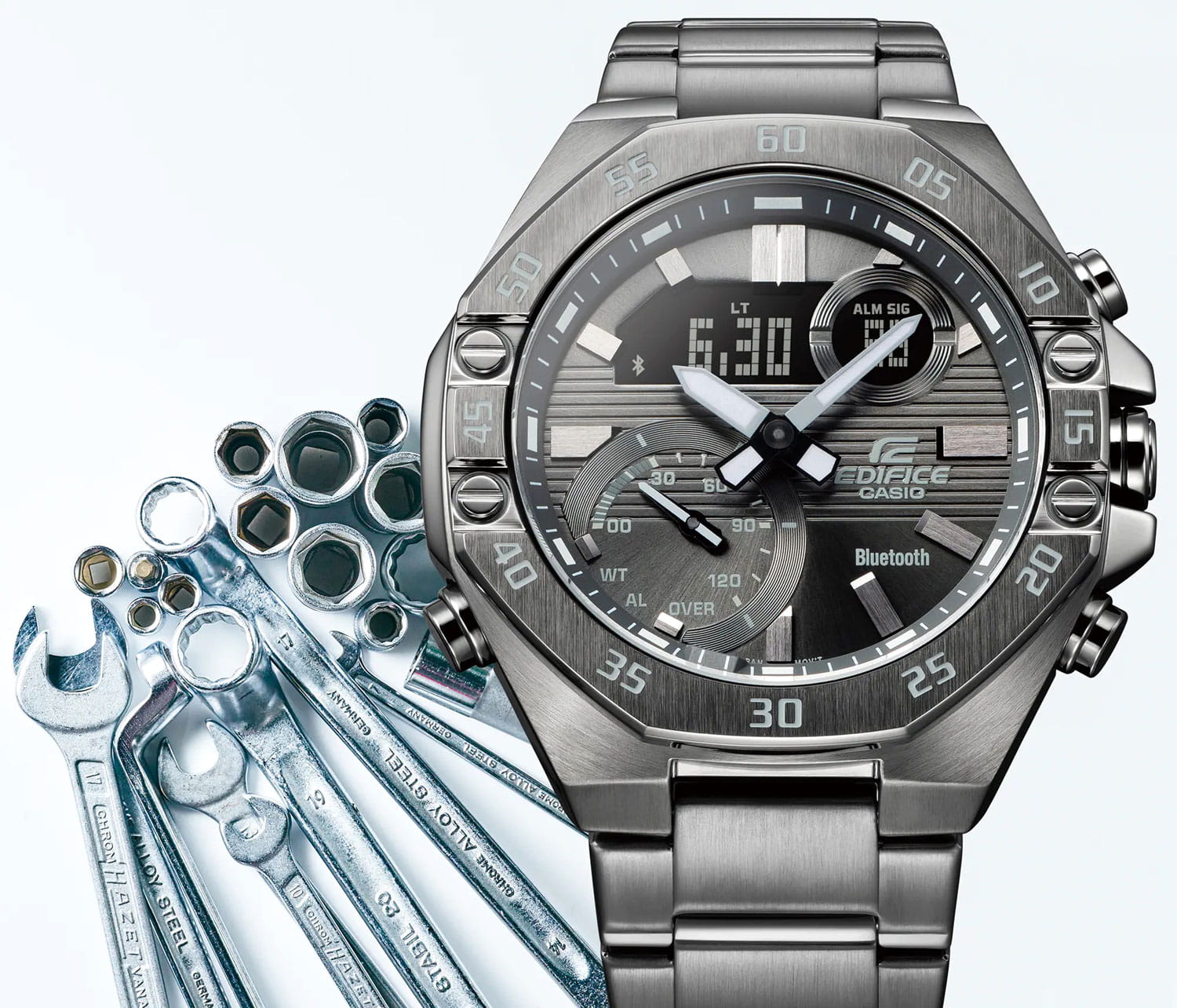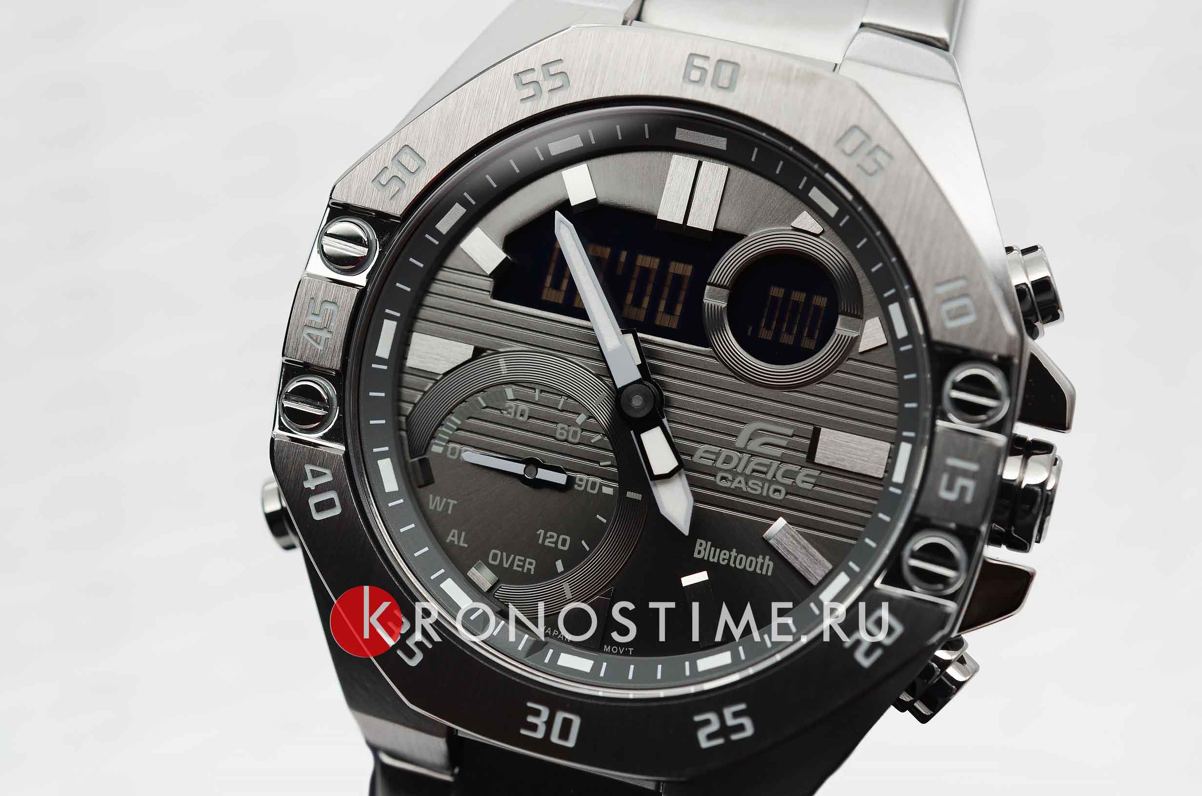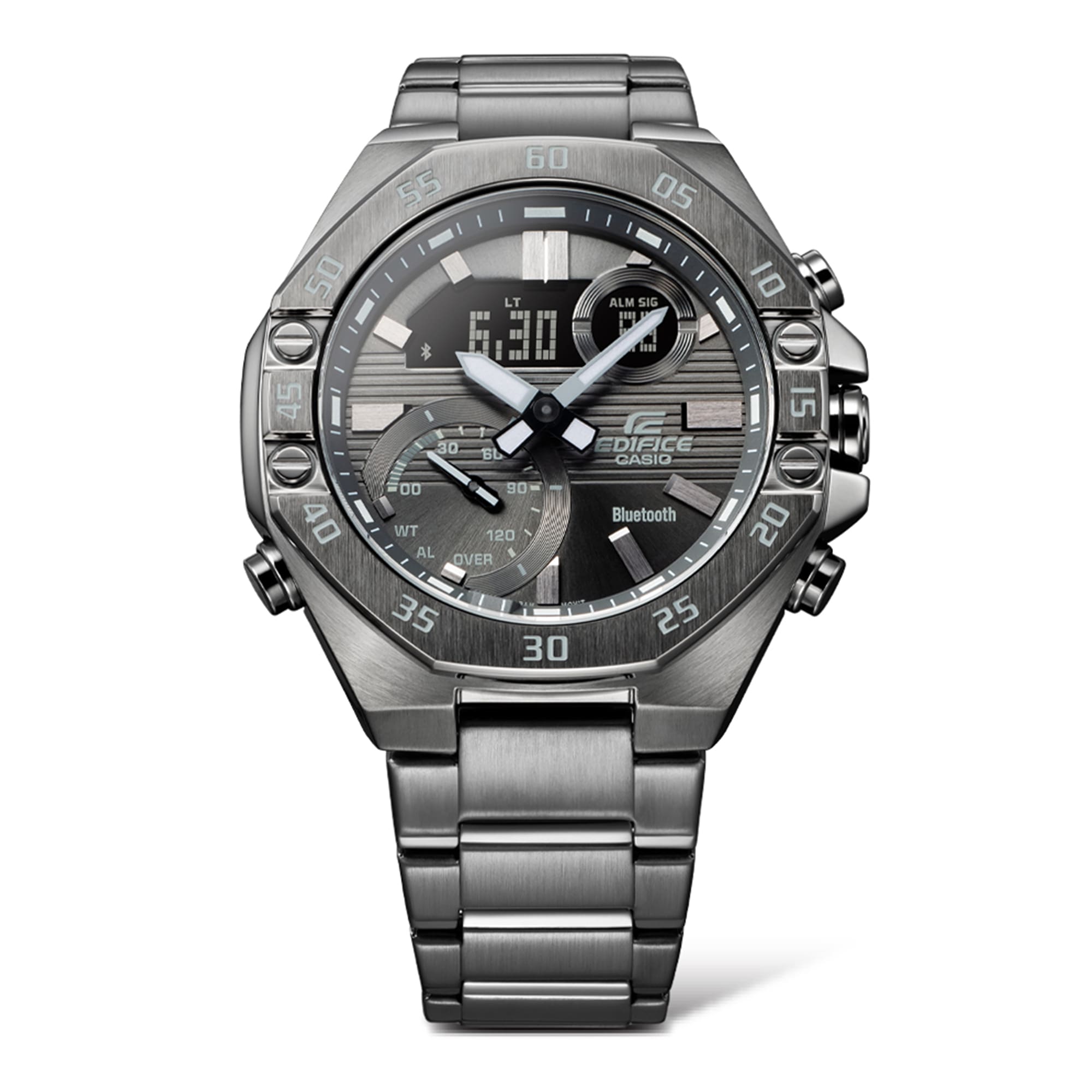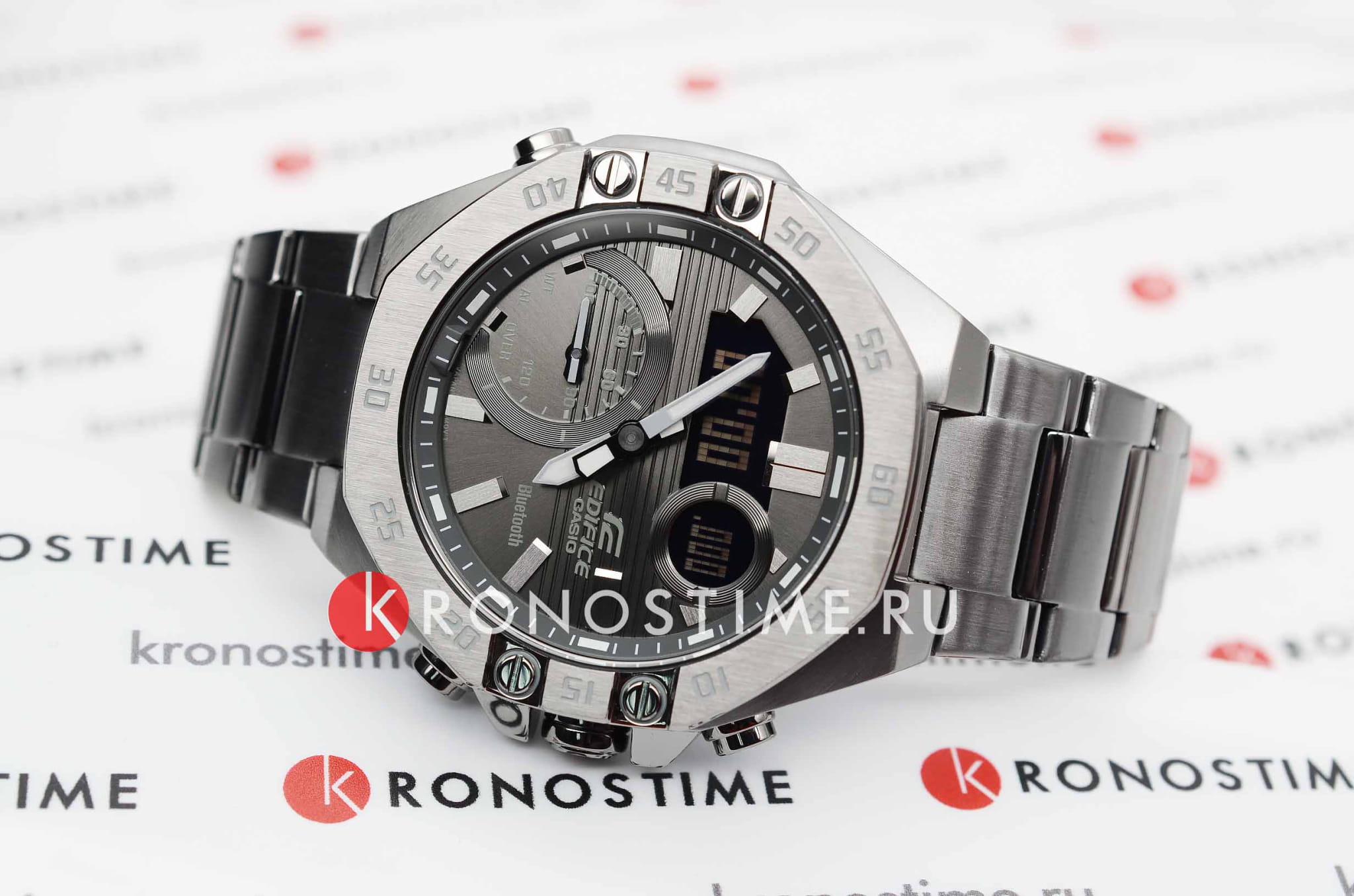Casio Edifice ECB-10DC-1B – современные мужские часы, сочетающие спортивный дизайн и передовые технологии. Корпус размером 51×48,5 мм и толщиной 12,5 мм выполнен из нержавеющей стали с IP-покрытиемIP-покрытиеМетод ионного напыления. Демонстрирует повышенную устойчивость к истиранию, окислению и химическим веществам. Под воздействием высокого давления и температуры около 1500°C молекулы металла надёжно соединяются с частицами корпуса часов. серого цвета, обеспечивая прочность и устойчивость к коррозии. Серый циферблат с аналогово-цифровым отображением времени защищён минеральным стекломМинеральное стеклоМинеральное стекло представляет собой искусственно выращенный минерал кварца. Такое стекло отличается особой устойчивостью к повреждениям и царапинам. Уступает по некоторым качествам сапфировому стеклу., устойчивым к царапинам.
