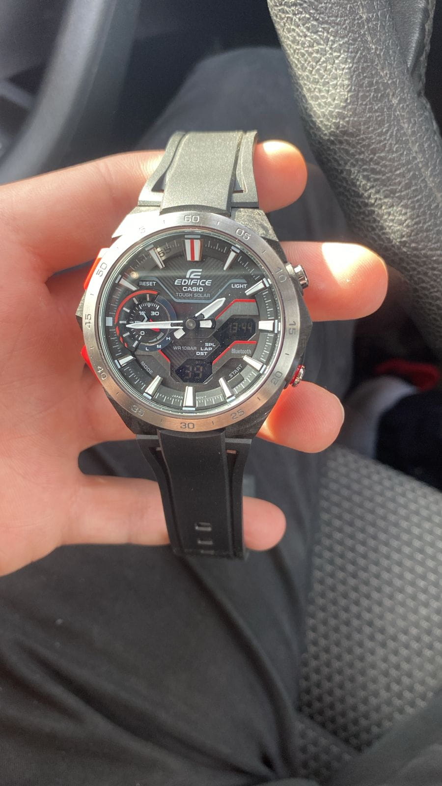 Мужские часы, дизайн которых вдохновлен воздушным потоком вокруг гоночного автомобиля. Многофункциональные японские мужские часы с BluetoothBluetoothСовременная технология, позволяющая синхронизировать часы с телефоном и переносить данные. Часы с Bluetooth расширяют возможности вашего смартфона и делают его использование ещё более удобным. Casio Edifice Windflow ECB-2200P-1AEF, кварцевый механизм с высокой точностью. Класс водозащиты: 100 метров, позволит плавать, нырять и заниматься другими водными видами спорта. Корпус часов изготовлен из карбона со стальной вставкой с IP-покрытиемIP-покрытиеМетод ионного напыления. Демонстрирует повышенную устойчивость к истиранию, окислению и химическим веществам. Под воздействием высокого давления и температуры около 1500°C молекулы металла надёжно соединяются с частицами корпуса часов.. Питание от солнечной энергии Tough SolarTough SolarТехнология основана на подзарядке аккумулятора от источника солнечного света, специальная панель улавливает солнечные лучи и преобразует их в энергию для работы часов. Достаточно пары минут нахождения на солнце для функционирования часов в течении суток. - солнечные батарейки большой мощности, индикатор заряда батареи. Функция автоматического сохранения энергии. Время работы аккумулятора без подзарядки приблизительно 7 месяцев, при включенной функции сохранения энергии приблизительно 18 месяцев. Двойная подcветка: циферблат и ЖК-дисплеи подсвечиваются светодиодомСветодиодная подсветкаСветодиодная или LED-подсветка обеспечивает появление яркого холодного свечения за счёт LED-элементов - маленьких лампочек. Они потребляют минимальное количество энергии, чаще всего можно встретить 1 светодиод, в нижней части циферблата., благодаря наличию функции задержки, после отпускания кнопки освещение горит еще несколько секунд. Настраиваемое послесвечение 1,5 или 3сек. Цвет подсветки: белый. Подсветка NeobriteПодсветка NeobriteИспользование светонакопительных составов на основе сульфида цинка или алюмината стронция, яркий свет можно наблюдать на протяжении 6-10 часов после «зарядки» часов около источника света. обеспечивает длительное послесвечение в темноте даже после кратковременного нахождения на свету. 12-ти и 24-х часовой формат времени. СекундомерСекундомерСекундоме́р — прибор, способный измерять интервалы времени с точностью до долей секунды. с двумя точностями показаний: 1/100с (до 1ч) и 1с (после 1ч) и временем измерения 24ч. Сплит-хронографСплит-хронографИспользуется для измерения продолжительности нескольких временных отрезков, начинающихся одновременно, а заканчивающихся в разное время.. ТаймерТаймерОтсчитывает секунды в обратном направлении в заданном интервале времени. обратного отсчета от 1с до 1ч. Мировое времяМировое время Полезное часовое усложнение, отображающее время в основных городах и известных областях по всему миру, оно связано с часовыми поясами, удобно для путешественников и бизнесменов. – 38 городов (38 часовых поясов), всемирное координированное время (UTCUTCВсемирное кординационное время, не имеющее привязки к географическому положению Гринвича, основывается на атомном отсчёте времени. Регулировка времени осуществляется более точно, чем устаревшее GMT.