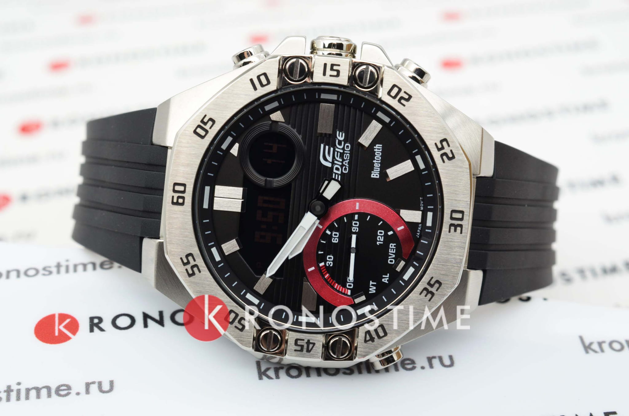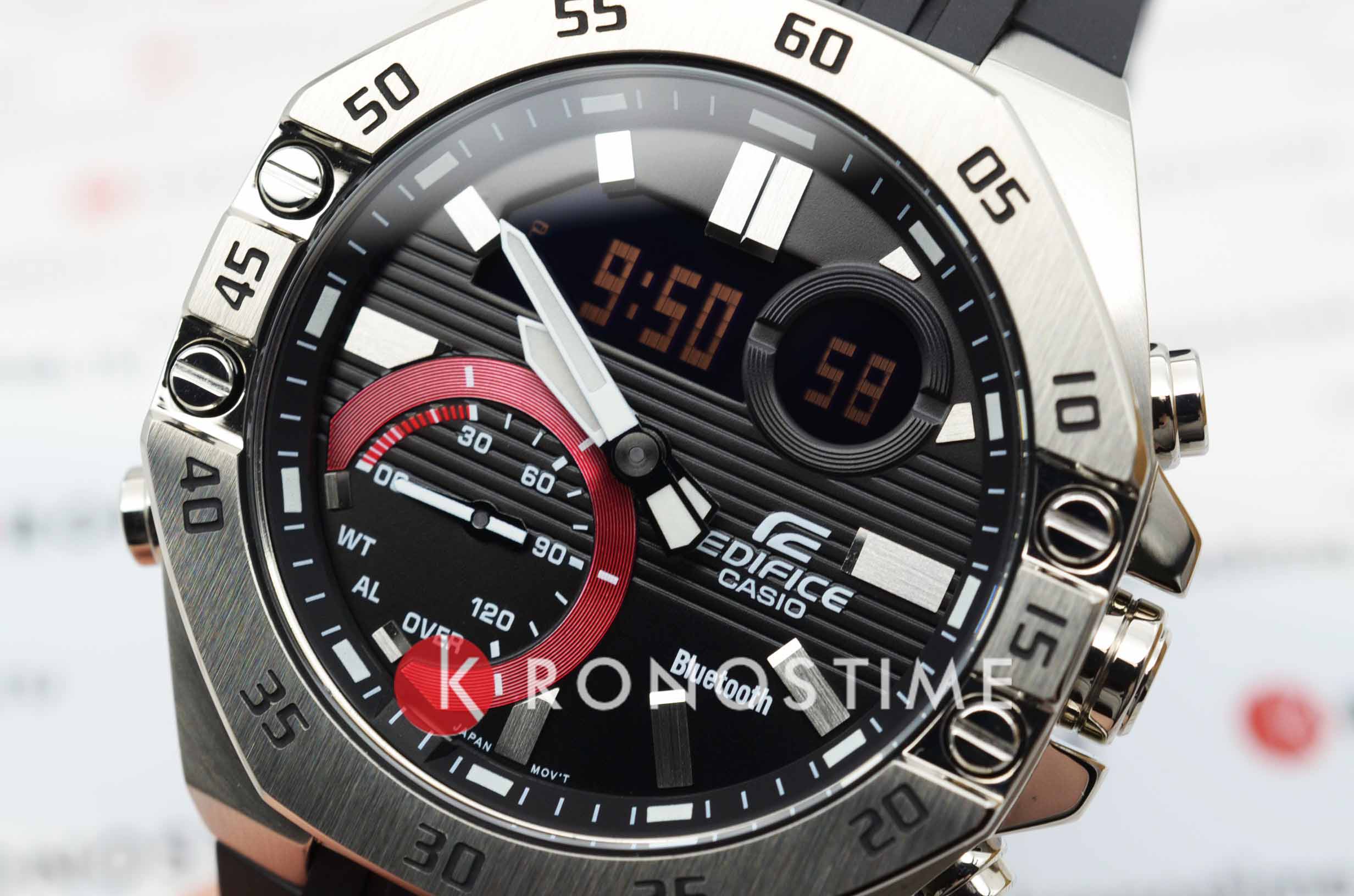 Casio Edifice ECB-10P-1ADF – мужские часы, сочетающие спортивный дизайн и современные технологии. Корпус размером 51×48,5 мм и толщиной 12,5 мм выполнен из нержавеющей стали, обеспечивая прочность и устойчивость к коррозии. Чёрный циферблат с аналогово-цифровым отображением времени защищён минеральным стекломМинеральное стеклоМинеральное стекло представляет собой искусственно выращенный минерал кварца. Такое стекло отличается особой устойчивостью к повреждениям и царапинам. Уступает по некоторым качествам сапфировому стеклу., устойчивым к царапинам.