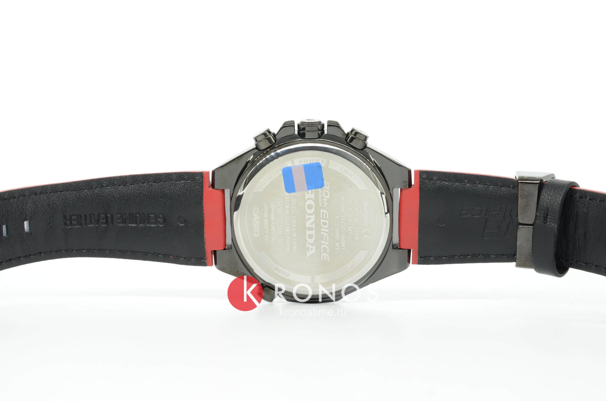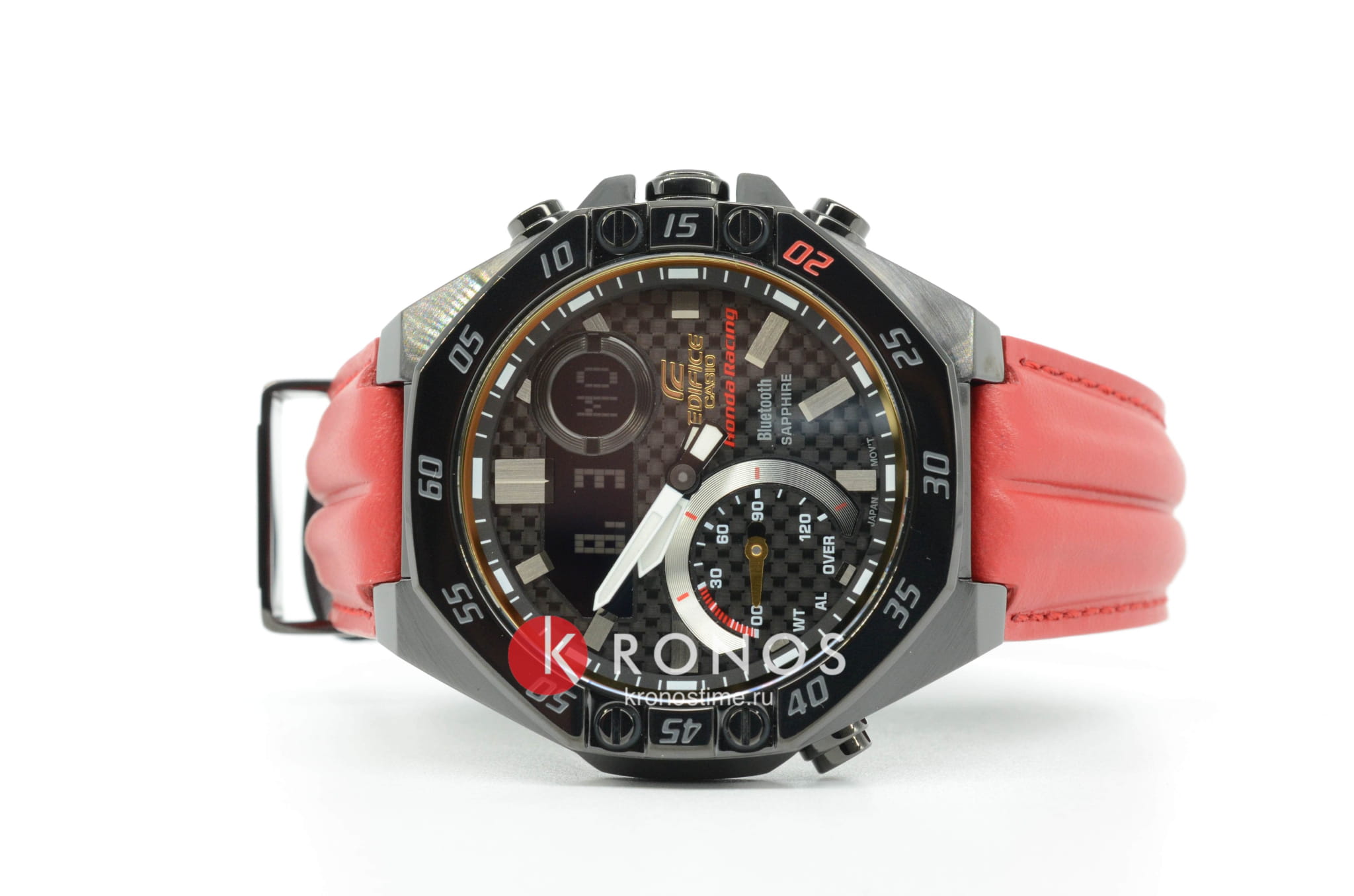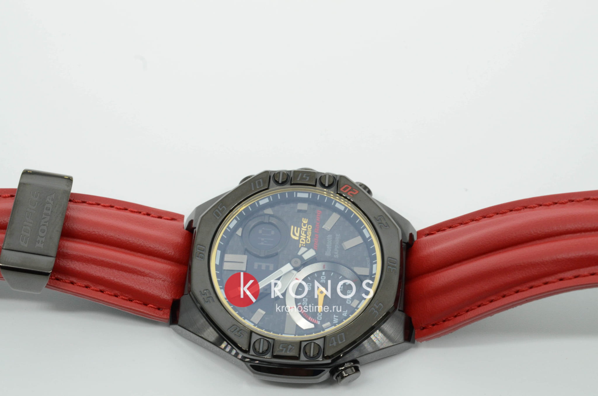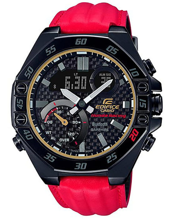 Casio Edifice ECB-10HR-1A – лимитированная модель, созданная в сотрудничестве с Honda Racing в честь 20-летия серии EDIFICE. Корпус размером 51×48,5 мм и толщиной 12,5 мм выполнен из нержавеющей стали с IP-покрытиемIP-покрытиеМетод ионного напыления. Демонстрирует повышенную устойчивость к истиранию, окислению и химическим веществам. Под воздействием высокого давления и температуры около 1500°C молекулы металла надёжно соединяются с частицами корпуса часов. чёрного цвета, обеспечивающим прочность и устойчивость к коррозии. Чёрный циферблат с карбоновыми вставками и аналогово-цифровым отображением времени защищён сапфировым стекломСапфировое стеклоПрочный и надёжный материал из кристалла сапфира синтетического происхождения, характеризующийся особой твёрдостью и устойчивостью к царапинам и повреждениям. с антибликовым покрытиемАнтибликовое покрытиеСлой оксида металла в 0,13-0,3 микрон, благодаря которому стекло часов не бликует и не отражает свет. Антибликовое покрытие уменьшает отражение света в 10 раз, обеспечивая отличную читаемость показателей циферблата., устойчивым к царапинам. Часы оснащены точным кварцевым механизмом с калибром 5618, обеспечивающим стабильное отображение времени. Функциональность модели включает BluetoothBluetoothСовременная технология, позволяющая синхронизировать часы с телефоном и переносить данные. Часы с Bluetooth расширяют возможности вашего смартфона и делают его использование ещё более удобным. для синхронизации со смартфоном, мировое времяМировое время Полезное часовое усложнение, отображающее время в основных городах и известных областях по всему миру, оно связано с часовыми поясами, удобно для путешественников и бизнесменов. , хронографХронографФункция позволяет измерять отрезки времени с особой точностью: часы, минуты, секунды. Верным признаком хронографа является наличие на циферблате 3 дополнительных окошек-счётчиков., таймерТаймерОтсчитывает секунды в обратном направлении в заданном интервале времени., будильникБудильникБуди́льник — часы, в заданный момент времени подающие звуковой, световой и/или в редких случаях другой сигнал. и автоматический календарь. Ремешок из красной натуральной кожи оснащён стандартной классической застёжкой, обеспечивающей комфортное ношение и надёжную фиксацию на запястье. Водозащита до 100 метров (10 бар) позволяет использовать часы при плавании и других водных видах спорта. Дизайн модели вдохновлён чёрно-красной цветовой гаммой униформы команды Honda F1, что подчёркивает её связь с миром автоспорта.