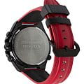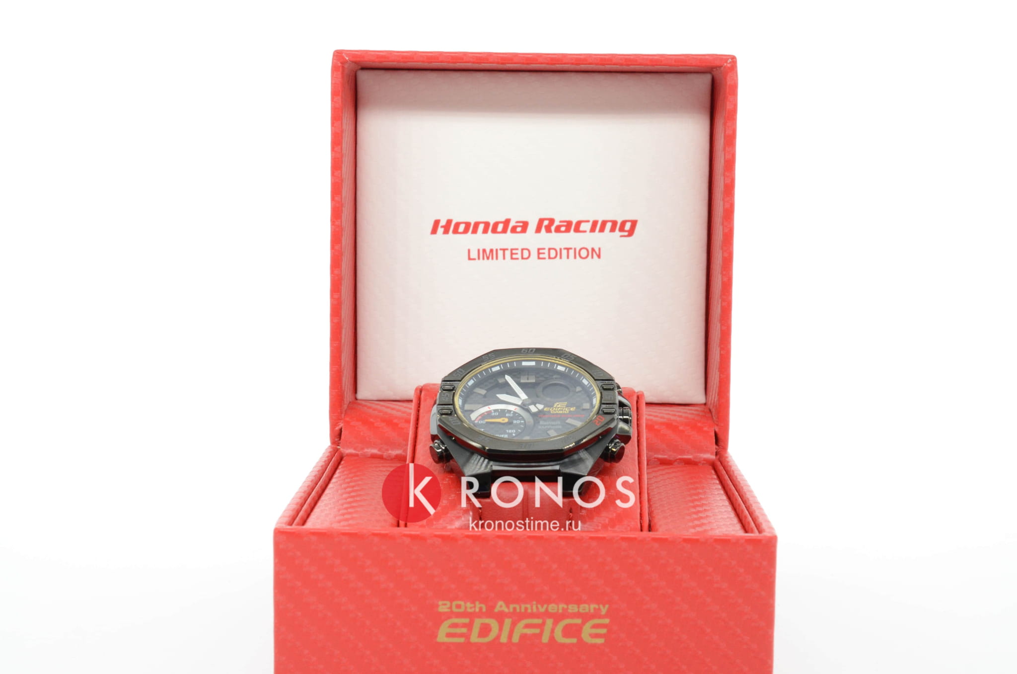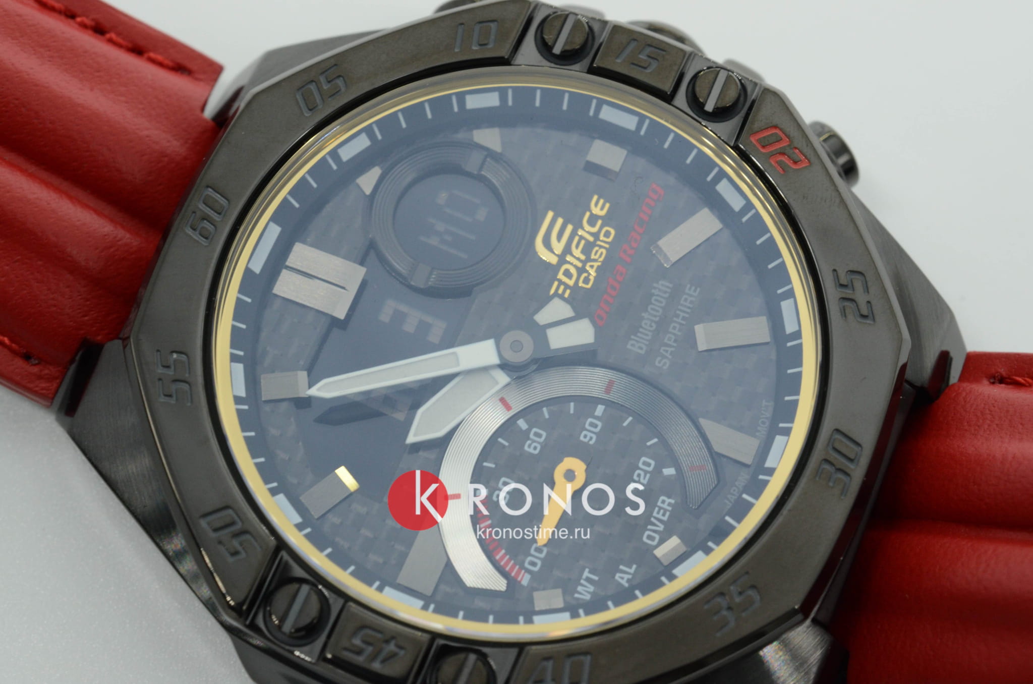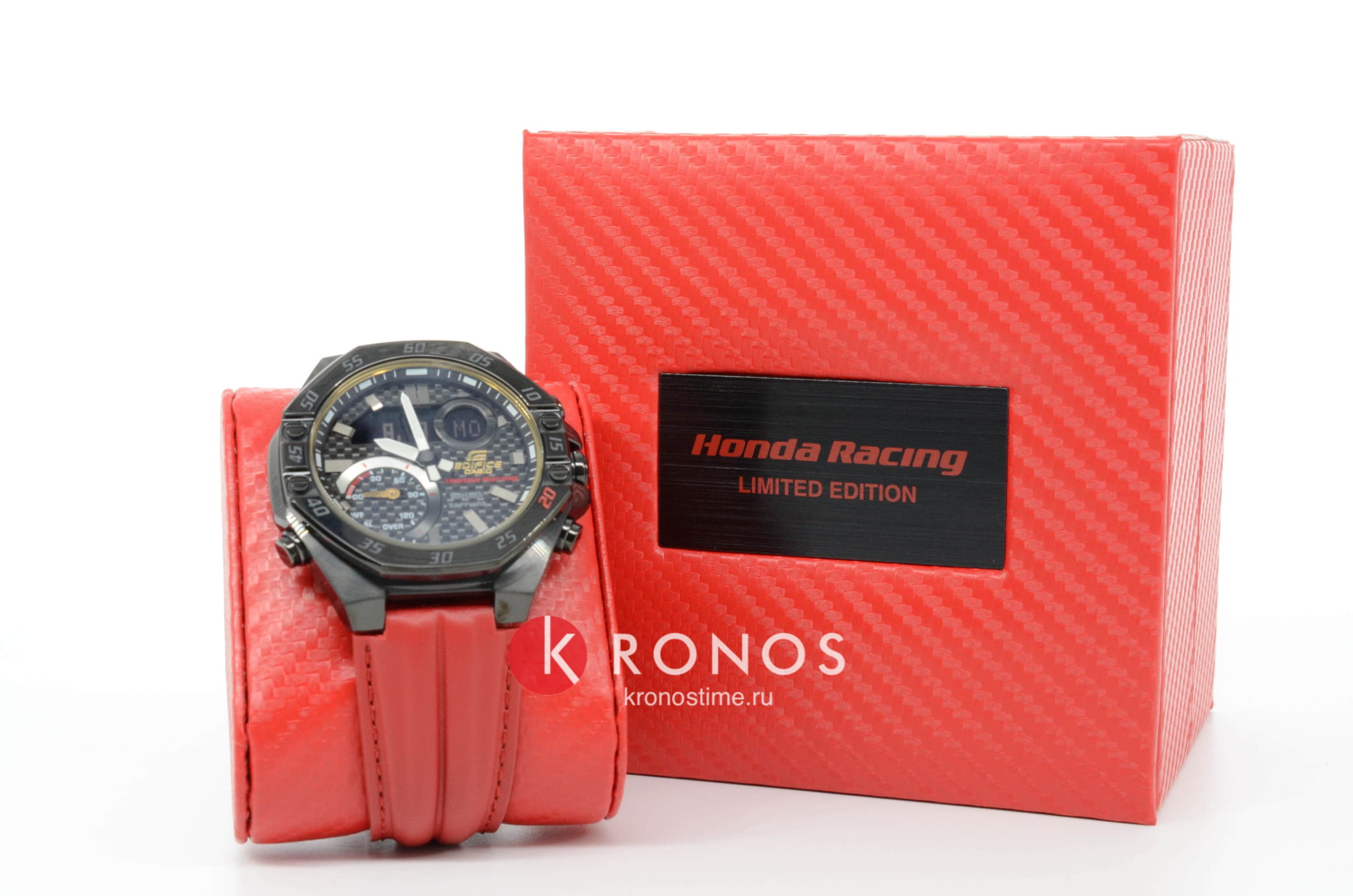 Casio Edifice ECB-10HR-1A – лимитированная модель, созданная в сотрудничестве с Honda Racing в честь 20-летия серии EDIFICE. Корпус размером 51×48,5 мм и толщиной 12,5 мм выполнен из нержавеющей стали с IP-покрытиемIP-покрытиеМетод ионного напыления. Демонстрирует повышенную устойчивость к истиранию, окислению и химическим веществам. Под воздействием высокого давления и температуры около 1500°C молекулы металла надёжно соединяются с частицами корпуса часов. чёрного цвета, обеспечивающим прочность и устойчивость к коррозии. Чёрный циферблат с карбоновыми вставками и аналогово-цифровым отображением времени защищён сапфировым стекломСапфировое стеклоПрочный и надёжный материал из кристалла сапфира синтетического происхождения, характеризующийся особой твёрдостью и устойчивостью к царапинам и повреждениям. с антибликовым покрытиемАнтибликовое покрытиеСлой оксида металла в 0,13-0,3 микрон, благодаря которому стекло часов не бликует и не отражает свет. Антибликовое покрытие уменьшает отражение света в 10 раз, обеспечивая отличную читаемость показателей циферблата., устойчивым к царапинам. Часы оснащены точным кварцевым механизмом с калибром 5618, обеспечивающим стабильное отображение времени. Функциональность модели включает BluetoothBluetoothСовременная технология, позволяющая синхронизировать часы с телефоном и переносить данные. Часы с Bluetooth расширяют возможности вашего смартфона и делают его использование ещё более удобным. для синхронизации со смартфоном, мировое времяМировое время Полезное часовое усложнение, отображающее время в основных городах и известных областях по всему миру, оно связано с часовыми поясами, удобно для путешественников и бизнесменов. , хронографХронографФункция позволяет измерять отрезки времени с особой точностью: часы, минуты, секунды. Верным признаком хронографа является наличие на циферблате 3 дополнительных окошек-счётчиков., таймерТаймерОтсчитывает секунды в обратном направлении в заданном интервале времени., будильникБудильникБуди́льник — часы, в заданный момент времени подающие звуковой, световой и/или в редких случаях другой сигнал. и автоматический календарь. Ремешок из красной натуральной кожи оснащён стандартной классической застёжкой, обеспечивающей комфортное ношение и надёжную фиксацию на запястье. Водозащита до 100 метров (10 бар) позволяет использовать часы при плавании и других водных видах спорта. Дизайн модели вдохновлён чёрно-красной цветовой гаммой униформы команды Honda F1, что подчёркивает её связь с миром автоспорта.