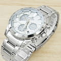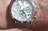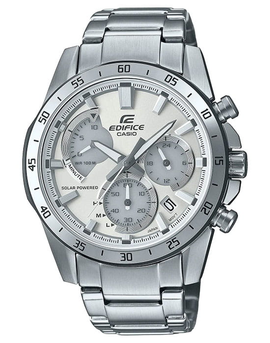 Работают на солнечной батарее. Полностью металлические, серебристый цвет. Водонепроницаемость до 100 метров. Отображение даты.