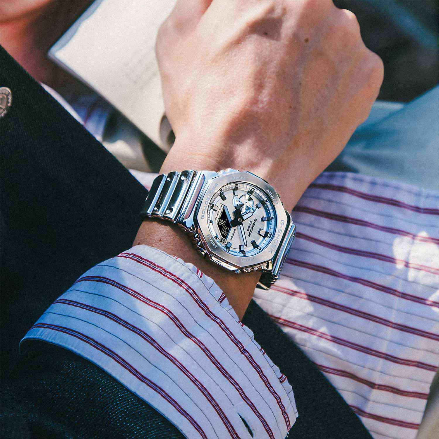 , есть функция включения/отключения летнего времени. Предусмотрено 5 будильников и ежечасный сигнал. Автоматический календарь отображает число, день недели и месяц, корректно работает до 2099 года. Для удобства просмотра информации реализована функция отключения звука и временного сдвига стрелок, чтобы не загораживать данные на цифровых дисплеях. Водонепроницаемость составляет , что позволяет использовать часы для плавания, ныряния и других водных видов спорта. Габаритные размеры — 44,4×49,3 мм, толщина — 11,8 мм, вес — 84 г. Батарея рассчитана на 3 года работы. Casio GM-2100YM-8A — это сочетание передовых технологий, прочности и современного дизайна для тех, кто ценит надёжность и функциональность.