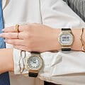 Японские женские часы-хронографХронографФункция позволяет измерять отрезки времени с особой точностью: часы, минуты, секунды. Верным признаком хронографа является наличие на циферблате 3 дополнительных окошек-счётчиков. Casio G-Shock GM-S5600BC-1. Передовая технология ковки придает металлическому безелюБезельВнешний ободок, закрепляющий стекло. В спортивных часах так называется поворотное кольцо с делениями на циферблате, выполняет роль таймера – замеряет отрезки времени на шкале. Неподвижный безель – элемент декора. Однонаправленно вращающийся безель на дайверских часах позволяет фиксировать моменты погружения и выныривания на поверхность., теперь более светлого желто-золотого цвета, вид драпированной ткани. Благодаря ярко контрастирующему черному ремешку, элегантному и изысканному дизайну эти часы займут достойное место в вашей шкатулке для украшений. Минеральное стеклоМинеральное стеклоМинеральное стекло представляет собой искусственно выращенный минерал кварца. Такое стекло отличается особой устойчивостью к повреждениям и царапинам. Уступает по некоторым качествам сапфировому стеклу. устойчивое к появлению царапин, обладающее высокой прозрачностью. Ударопрочный корпусУдаропрочный корпусМеханизм заключён в корпус, выполненный из современных материалов, устойчивых к ударам, механическим повреждениям и падению с высоты: инновационный пластик, карбон, нержавеющая сталь, титан. с IP-покрытиемIP-покрытиеМетод ионного напыления. Демонстрирует повышенную устойчивость к истиранию, окислению и химическим веществам. Под воздействием высокого давления и температуры около 1500°C молекулы металла надёжно соединяются с частицами корпуса часов. защищает механизм от ударов и вибрации. Светодиодная подсветкаСветодиодная подсветкаСветодиодная или LED-подсветка обеспечивает появление яркого холодного свечения за счёт LED-элементов - маленьких лампочек. Они потребляют минимальное количество энергии, чаще всего можно встретить 1 светодиод, в нижней части циферблата. освещает весь циферблат, после отпускания кнопки свечение продолжается еще некоторое время. Настраиваемое послесвечение 1,5 или 3сек. СекундомерСекундомерСекундоме́р — прибор, способный измерять интервалы времени с точностью до долей секунды. с точностью измерения 1/100 секунды и измерением до 23 часов 59 минут 59,99 cек. ТаймерТаймерОтсчитывает секунды в обратном направлении в заданном интервале времени. обратного отсчета (диапазон времени 24 часа), автоматический календарь, 12/24 отображение времени. будильникБудильникБуди́льник — часы, в заданный момент времени подающие звуковой, световой и/или в редких случаях другой сигнал., ежечасный сигнал. Батарея рассчитана на 3 года. Класс водозащиты: 200 метров, позволит плавать, нырять и заниматься другими водными видами спорта. Ремешок из полимерного материала на стандартной застежке.