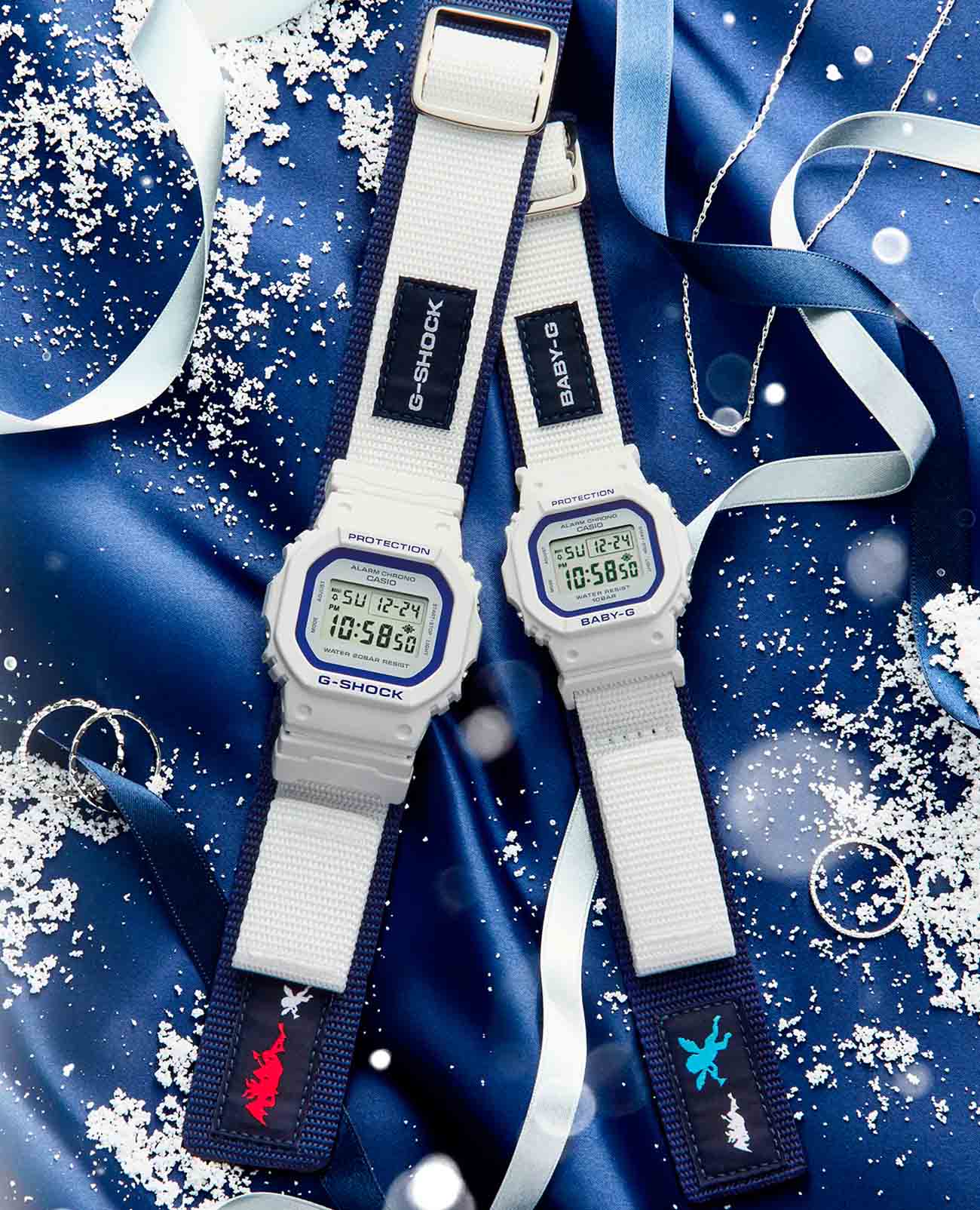 В этом году G представляет коллекцию Lover's Collection LOV-23A-7, в которую входят G-Shock DW-5600 и Baby-G BGD-565. В часах использованы белый и синий цвета и тканевые ремешки первой коллекции Lover's, выпущенной в 1996 году. Эти часы, выпущенные ограниченным тиражом, украшены вышитыми ангелом и дьяволом бирками на нижних ремешках, графическими изображениями red angel (BGD-565) и devil (DW-5600) на светодиодной подсветкеСветодиодная подсветкаСветодиодная или LED-подсветка обеспечивает появление яркого холодного свечения за счёт LED-элементов - маленьких лампочек. Они потребляют минимальное количество энергии, чаще всего можно встретить 1 светодиод, в нижней части циферблата. и специальной гравировкой Lover's Collection на задней крышке корпуса из нержавеющей стали. Обе пары имеют ударопрочный корпусУдаропрочный корпусМеханизм заключён в корпус, выполненный из современных материалов, устойчивых к ударам, механическим повреждениям и падению с высоты: инновационный пластик, карбон, нержавеющая сталь, титан., часовой сигнал времени, секундомерСекундомерСекундоме́р — прибор, способный измерять интервалы времени с точностью до долей секунды., таймерТаймерОтсчитывает секунды в обратном направлении в заданном интервале времени., многофункциональный будильникБудильникБуди́льник — часы, в заданный момент времени подающие звуковой, световой и/или в редких случаях другой сигнал., 12 и 24-часовой формат времени, вечный календарьВечный календарьКлассическое часовое усложнение, представляющее собой календарь, рассчитанный на несколько лет вперёд (стандартно – до 2099 года). Определяет текущую дату, день недели, месяц.. Стилизованная светодиодная подсветкаСветодиодная подсветкаСветодиодная или LED-подсветка обеспечивает появление яркого холодного свечения за счёт LED-элементов - маленьких лампочек. Они потребляют минимальное количество энергии, чаще всего можно встретить 1 светодиод, в нижней части циферблата. освещает весь циферблат, после отпускания кнопки свечение продолжается еще некоторое время. Тканевый ремешок на стандартной застежке. G-Shock DW-5600 имеет вес 57гр, парметры: 48.9 × 42.8 × 13.4 мм. Класс водозащиты: 200 метров, позволит плавать, нырять и заниматься другими водными видами спорта. Baby-G BGD-565 имеет вес 35гр, параметры: 42.1 × 37.9 × 11.3 мм. Класс водозащиты: 100 метров, позволит плавать, нырять и заниматься другими водными видами спорта.