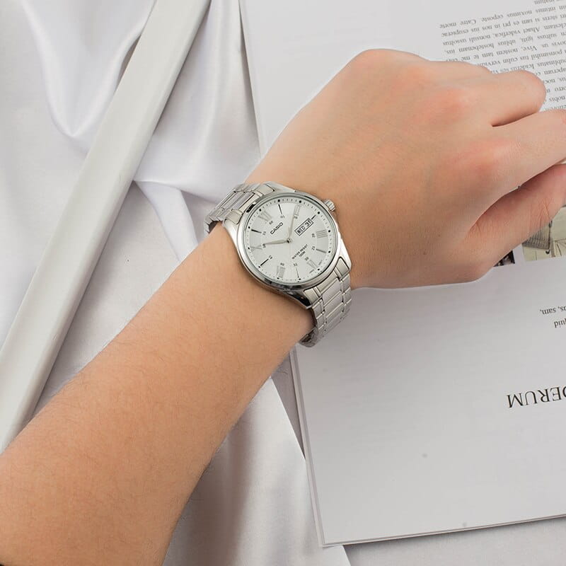 Японские мужские наручные часы с минеральным стекломМинеральное стеклоМинеральное стекло представляет собой искусственно выращенный минерал кварца. Такое стекло отличается особой устойчивостью к повреждениям и царапинам. Уступает по некоторым качествам сапфировому стеклу. Casio Collection MTP-1384D-7A, кварцевый механизм с высокой точностью. Класс водозащиты: 100 метров, позволит плавать, нырять и заниматься другими водными видами спорта. Корпус часов изготовлен из стали. Стальной браслет на раскладной застёжкеРаскладная застёжкаТакой тип застёжки используется только на браслетах из металла. Она никогда не раскрывается полностью, происходит разделение на 2 и более частей. Раскладывающая застёжка снизит вероятность потери часов к минимуму.. Окошки дня недели и даты находятся в положении 3 часа. Заводная головка с защитой. Задняя крышка с винтовым фиксатором.