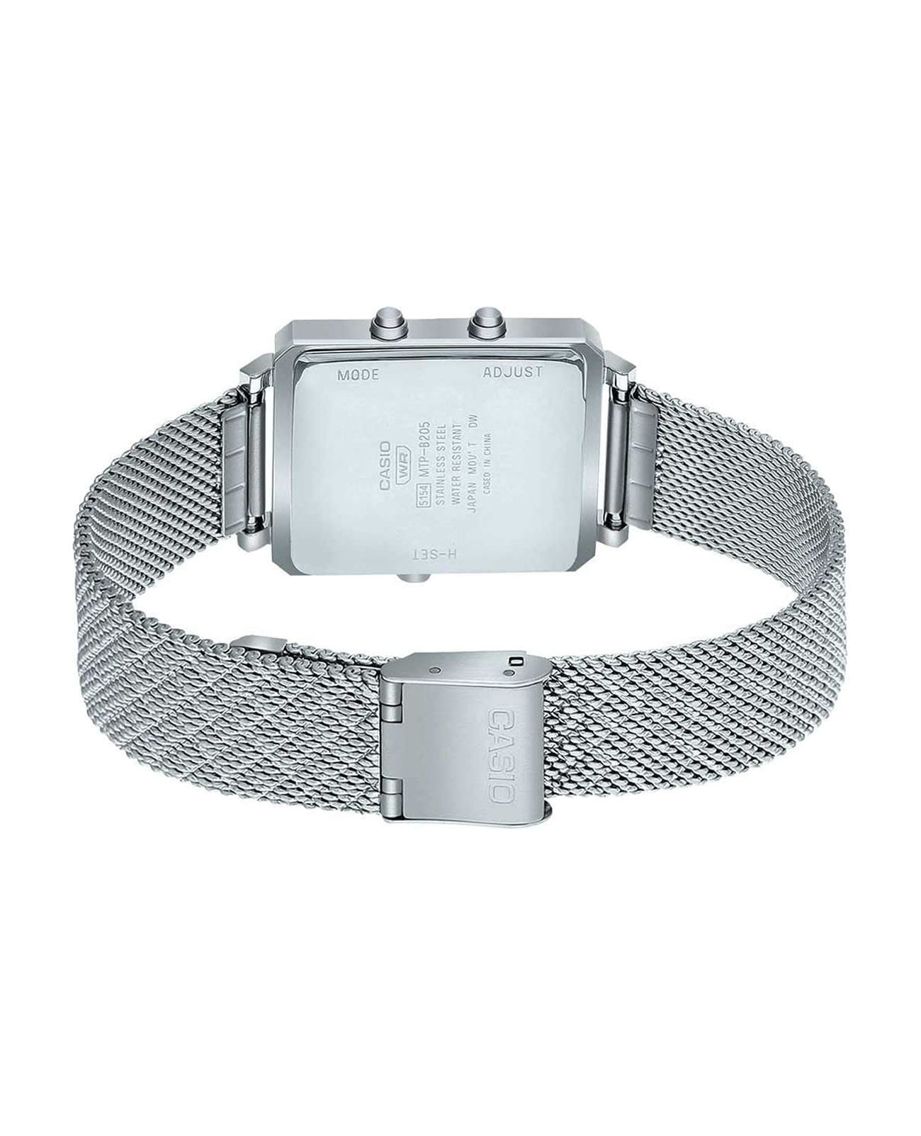 Японские мужские часы-хронографХронографФункция позволяет измерять отрезки времени с особой точностью: часы, минуты, секунды. Верным признаком хронографа является наличие на циферблате 3 дополнительных окошек-счётчиков. с минеральным стекломМинеральное стеклоМинеральное стекло представляет собой искусственно выращенный минерал кварца. Такое стекло отличается особой устойчивостью к повреждениям и царапинам. Уступает по некоторым качествам сапфировому стеклу. Casio Collection MTP-B205M-5E, кварцевый механизм с высокой точностью. Корпус часов изготовлен из стали. 2 и 24-часовой формат времени. СекундомерСекундомерСекундоме́р — прибор, способный измерять интервалы времени с точностью до долей секунды. с точностью показаний 1/100с и временем измерения 60мин. Второй часовой пояс. Циферблат с метками в виде штрихов выполнен по технологии Sunray (солнечные лучи). Батарея рассчитана на 3 года. Класс водозащиты: 50 метров, позволит защитить корпус от случайных брызг или капель дождя. Стальной браслет миланского плетения на раскладном замкеРаскладной замокДанный вариант застежки используется только на часах с металлическим браслетом. Отличительная особенность такого крепления в том, что длина браслета становится универсальной и вы можете самостоятельно отрегулировать нужный вам размер – застежка просто двигается по браслету часов..