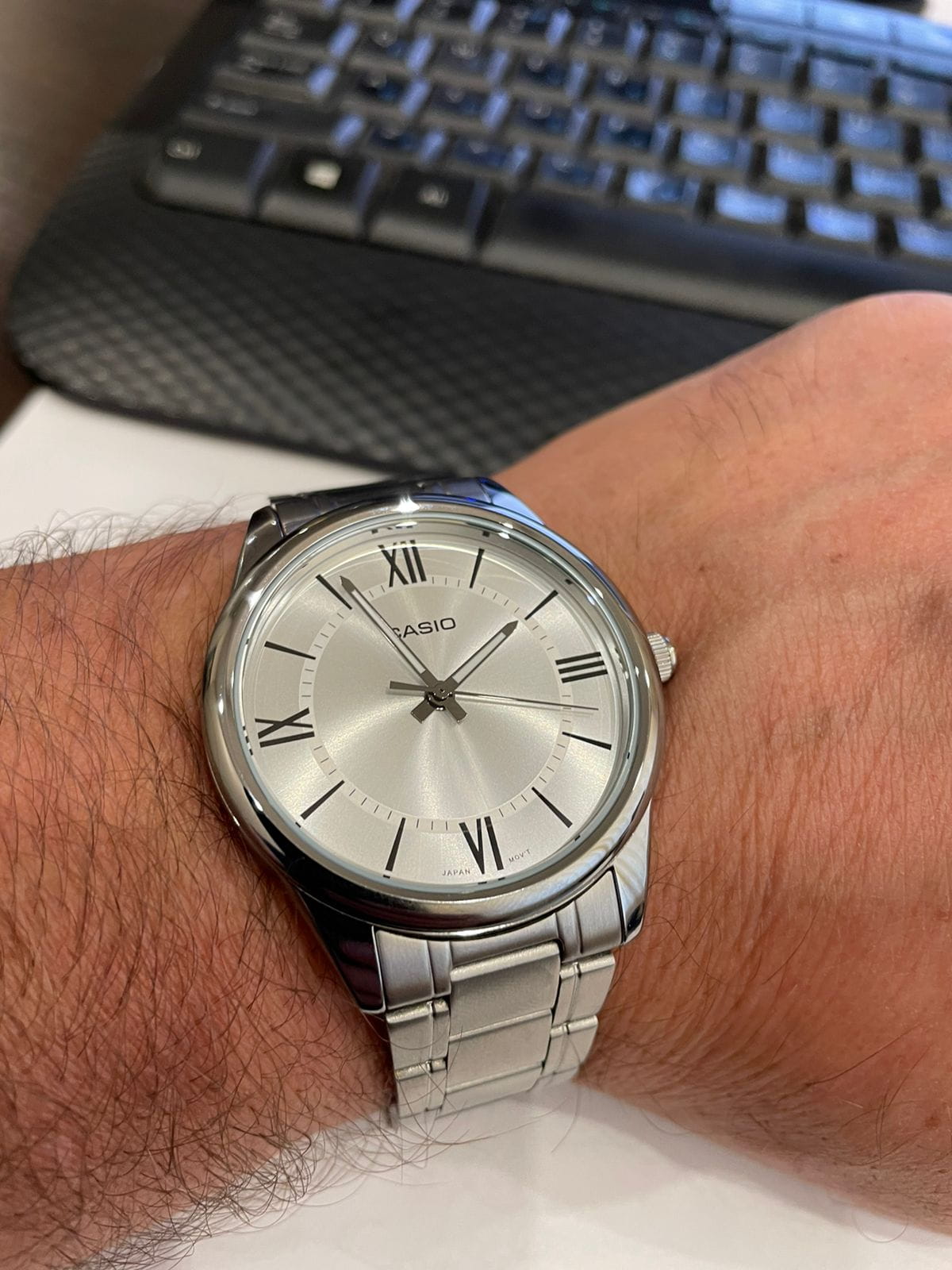 Японские мужские часы с минеральным стекломМинеральное стеклоМинеральное стекло представляет собой искусственно выращенный минерал кварца. Такое стекло отличается особой устойчивостью к повреждениям и царапинам. Уступает по некоторым качествам сапфировому стеклу. Casio Collection MTP-V005D-7B5, кварцевый механизм с высокой точностью. Класс водозащиты: 30 метров, позволит защитить корпус от случайных брызг или капель дождя. Корпус и браслет часов изготовлены из стали. Браслет с раскладной застёжкойРаскладная застёжкаТакой тип застёжки используется только на браслетах из металла. Она никогда не раскрывается полностью, происходит разделение на 2 и более частей. Раскладывающая застёжка снизит вероятность потери часов к минимуму..