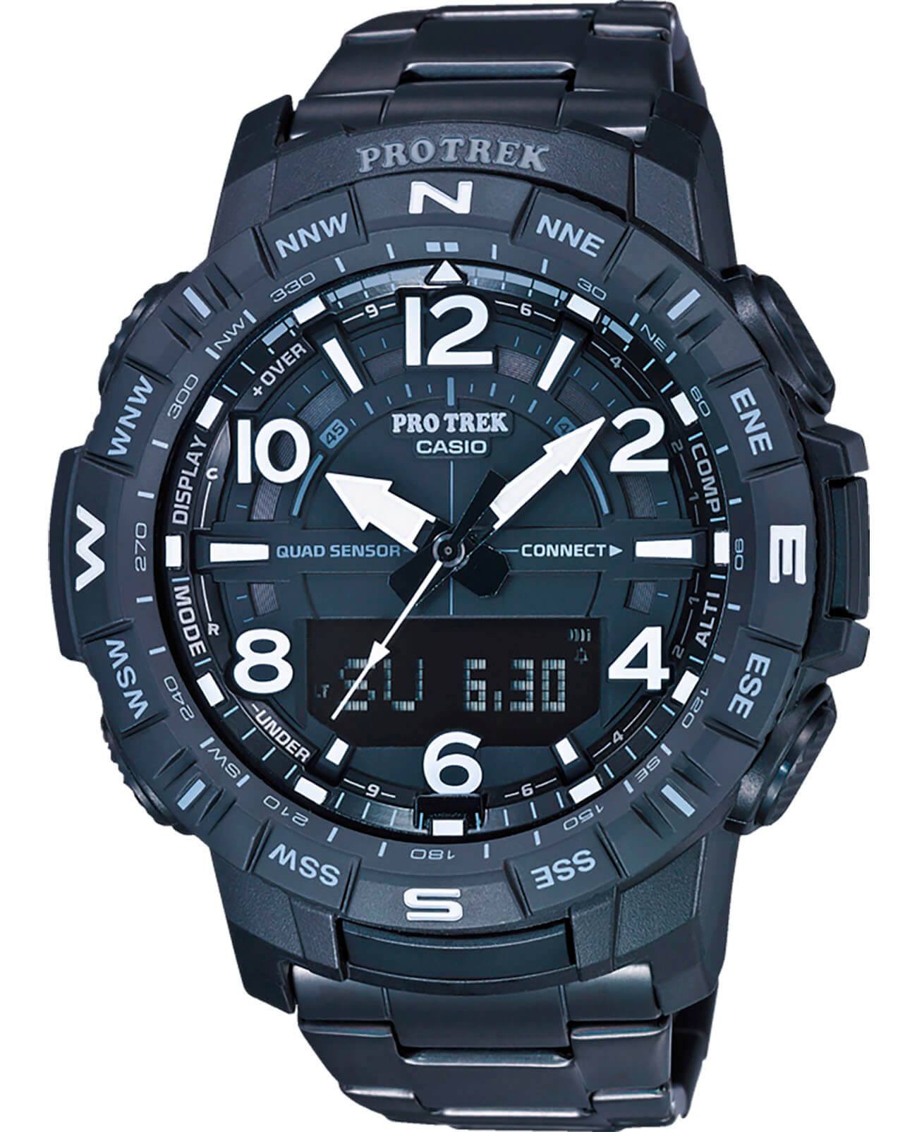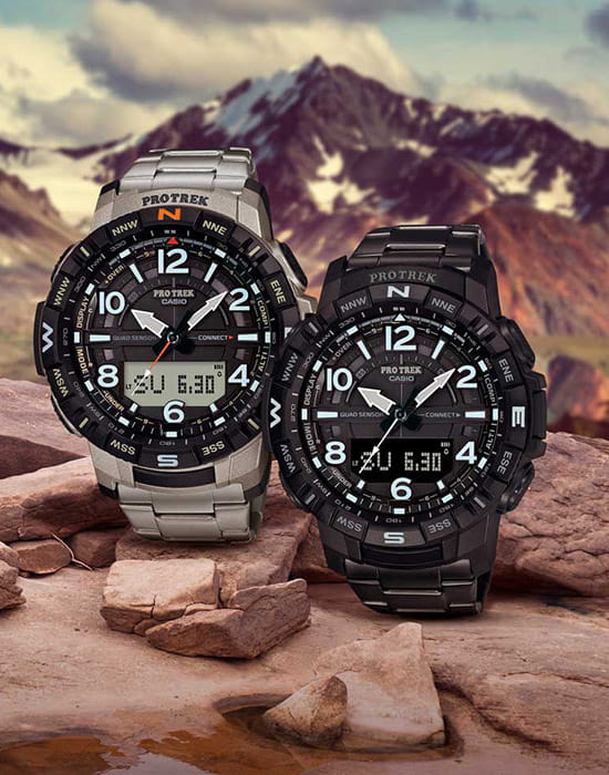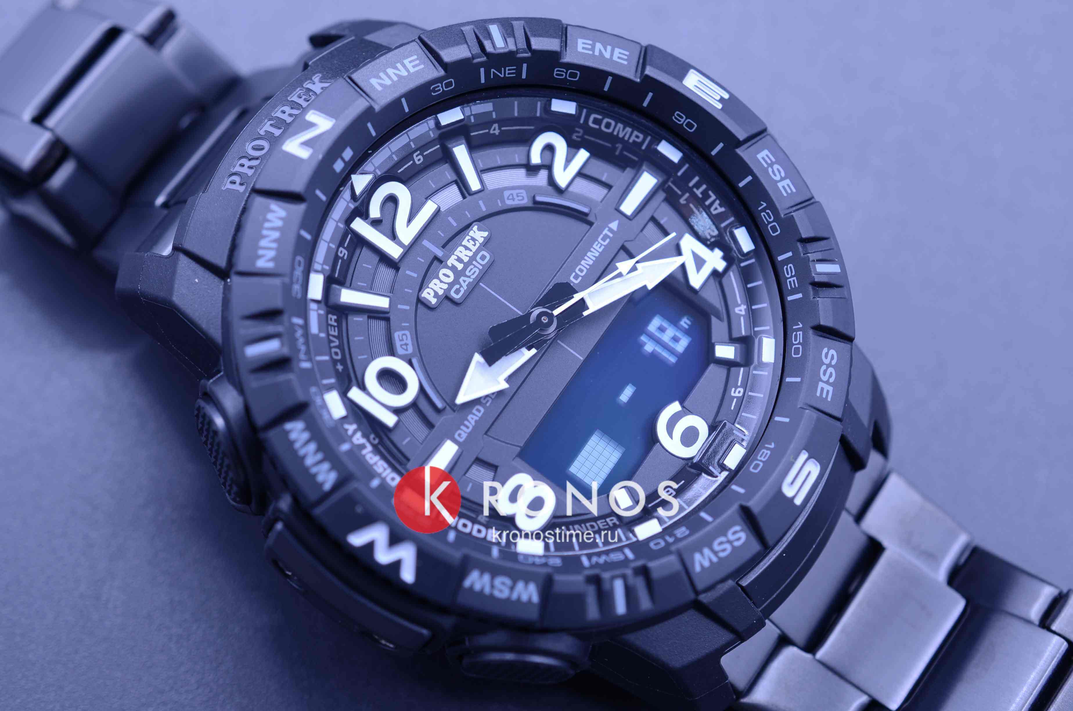 Аксессуар представлен в спортивном стиле, внимание привлекают угловатые детали и крупные габариты. Наручные часы в черной стелс-расцветке оснащены множеством функций, необходимых для активного времяпрепровождения на природе, решения повседневных задач. Это термометр -10°C /+60°C, компас, барометр, график восхода и заката солнца, высотомер, мировое времяМировое время Полезное часовое усложнение, отображающее время в основных городах и известных областях по всему миру, оно связано с часовыми поясами, удобно для путешественников и бизнесменов. , шагомер, хронографХронографФункция позволяет измерять отрезки времени с особой точностью: часы, минуты, секунды. Верным признаком хронографа является наличие на циферблате 3 дополнительных окошек-счётчиков., будильник, календарь. Японский кварцевый механизм с точностью хода -/+15 секунд в месяц получает питание от батарейки, рассчитанной на 2-летний срок службы. Ударопрочный корпусУдаропрочный корпусМеханизм заключён в корпус, выполненный из современных материалов, устойчивых к ударам, механическим повреждениям и падению с высоты: инновационный пластик, карбон, нержавеющая сталь, титан. сделан из полимера, идеальным дополнением к нему стал титановый браслет с IP-покрытиемIP-покрытиеМетод ионного напыления. Демонстрирует повышенную устойчивость к истиранию, окислению и химическим веществам. Под воздействием высокого давления и температуры около 1500°C молекулы металла надёжно соединяются с частицами корпуса часов.. Электролюминесцентная подсветкаЭлектролюминесцентная подсветкаЭлектролюминесцентная панель устанавливается под ЖК-экраном часов, при нажатии кнопки электричество преобразуется в свет за счёт подачи напряжения на атомы фосфора, такой тип подсветки позволяет освещать весь циферблат. освещает дисплей, светодиодСветодиодная подсветкаСветодиодная или LED-подсветка обеспечивает появление яркого холодного свечения за счёт LED-элементов - маленьких лампочек. Они потребляют минимальное количество энергии, чаще всего можно встретить 1 светодиод, в нижней части циферблата. применяется для циферблата. Минеральное стекло защищает циферблат от повреждений, отличается устойчивостью к царапинам. Класс водостойкости – WR 100, часы подходят для плавания. Габариты: 57,5 x 50,8 x 15,8 мм.