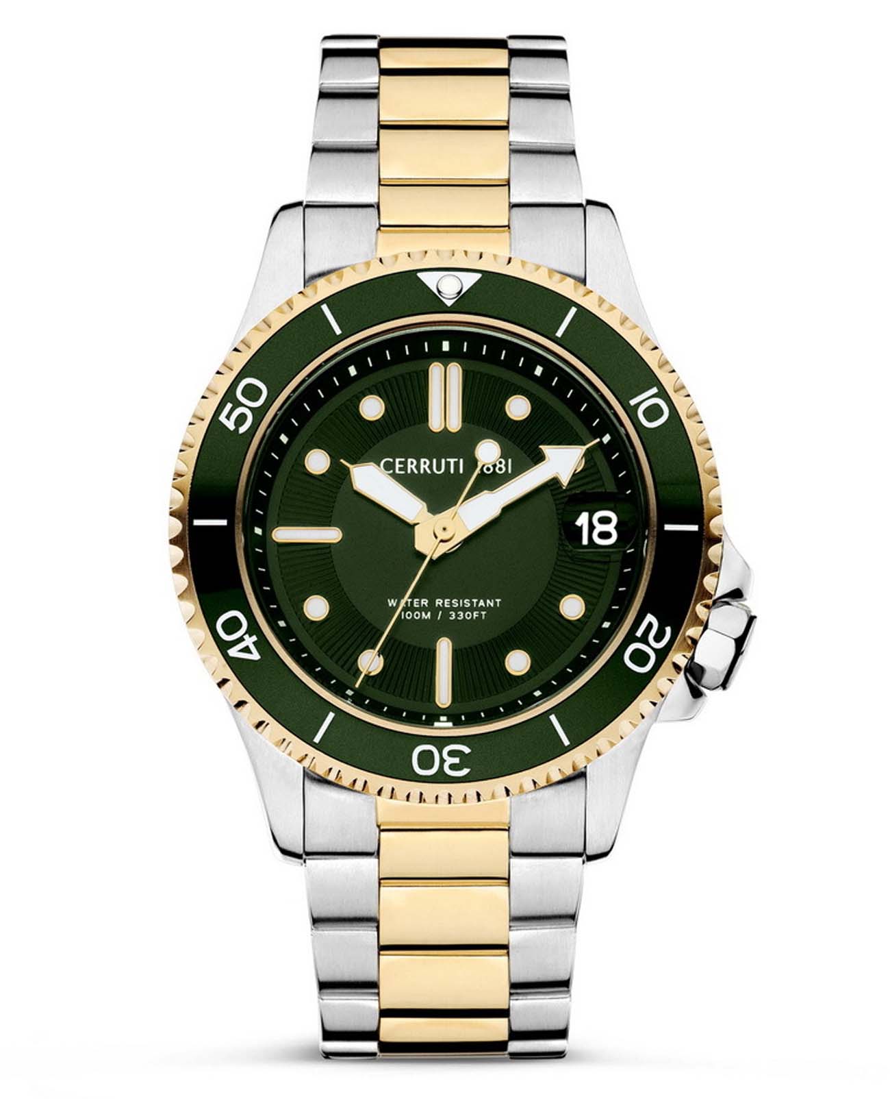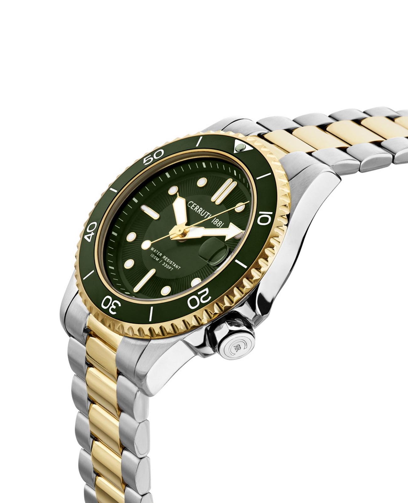 Французские мужские часы Cerruti 1881 Pesaro CIWGH2224208, кварцевый механизм с высокой точностью. Минеральное стеклоМинеральное стеклоМинеральное стекло представляет собой искусственно выращенный минерал кварца. Такое стекло отличается особой устойчивостью к повреждениям и царапинам. Уступает по некоторым качествам сапфировому стеклу. устойчивое к мелким механическим повреждениям. Корпус часов изготовлен из стали. БезельБезельВнешний ободок, закрепляющий стекло. В спортивных часах так называется поворотное кольцо с делениями на циферблате, выполняет роль таймера – замеряет отрезки времени на шкале. Неподвижный безель – элемент декора. Однонаправленно вращающийся безель на дайверских часах позволяет фиксировать моменты погружения и выныривания на поверхность. с IP-покрытиемIP-покрытиеМетод ионного напыления. Демонстрирует повышенную устойчивость к истиранию, окислению и химическим веществам. Под воздействием высокого давления и температуры около 1500°C молекулы металла надёжно соединяются с частицами корпуса часов.. Циферблат выполнен с метками в виде штрихов и точек. Окошко даты находится в положении 3 часа. Стрелки и метки с люминесцентным покрытиемЛюминесцентное покрытиеПозволяет считывать показания времени в темноте. Производители наносят на стрелки, часовые индексы, безель или поверхность циферблата светонакопительный состав, дающий холодное свечение.. Класс водозащиты: 100 метров, позволит плавать, нырять и заниматься другими водными видами спорта. Стальной браслет с частичным IP-покрытиемIP-покрытиеМетод ионного напыления. Демонстрирует повышенную устойчивость к истиранию, окислению и химическим веществам. Под воздействием высокого давления и температуры около 1500°C молекулы металла надёжно соединяются с частицами корпуса часов. на застёжке-бабочке с кнопкамиЗастёжка "бабочка"Такой вид застёжки дополняется предохранителями, помогающими избежать случайного раскрытия браслета. Обладают изящным исполнением. .