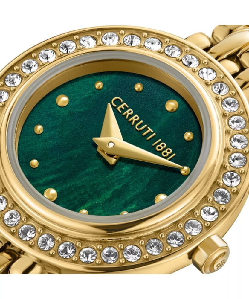Cerruti 1881 CIWLG0073003 — изысканные женские часы, созданные в лучших традициях итальянской элегантности. Круглый корпус из нержавеющей стали с благородным золотым IP-покрытиемIP-покрытиеМетод ионного напыления. Демонстрирует повышенную устойчивость к истиранию, окислению и химическим веществам. Под воздействием высокого давления и температуры около 1500°C молекулы металла надёжно соединяются с частицами корпуса часов. и сияющим безелемБезельВнешний ободок, закрепляющий стекло. В спортивных часах так называется поворотное кольцо с делениями на циферблате, выполняет роль таймера – замеряет отрезки времени на шкале. Неподвижный безель – элемент декора. Однонаправленно вращающийся безель на дайверских часах позволяет фиксировать моменты погружения и выныривания на поверхность., украшенным кристаллами, придаёт модели утончённый и праздничный вид. Глубокий зелёный циферблат с солнечным переливом оформлен лаконично и стильно: миниатюрные метки в виде кристаллов подчёркивают ювелирный характер аксессуара. Прочное минеральное стеклоМинеральное стеклоМинеральное стекло представляет собой искусственно выращенный минерал кварца. Такое стекло отличается особой устойчивостью к повреждениям и царапинам. Уступает по некоторым качествам сапфировому стеклу. защищает поверхность от царапин, а металлический браслет с IP-покрытиемIP-покрытиеМетод ионного напыления. Демонстрирует повышенную устойчивость к истиранию, окислению и химическим веществам. Под воздействием высокого давления и температуры около 1500°C молекулы металла надёжно соединяются с частицами корпуса часов. полированными звеньями оснащён застёжкой «бабочка»Застёжка "бабочка"Такой вид застёжки дополняется предохранителями, помогающими избежать случайного раскрытия браслета. Обладают изящным исполнением. , обеспечивающей комфортное прилегание и надёжную фиксацию. Cerruti 1881 — это воплощение женственности и роскоши, идеально подходящее для тех, кто ценит утончённый стиль и блеск итальянской моды.